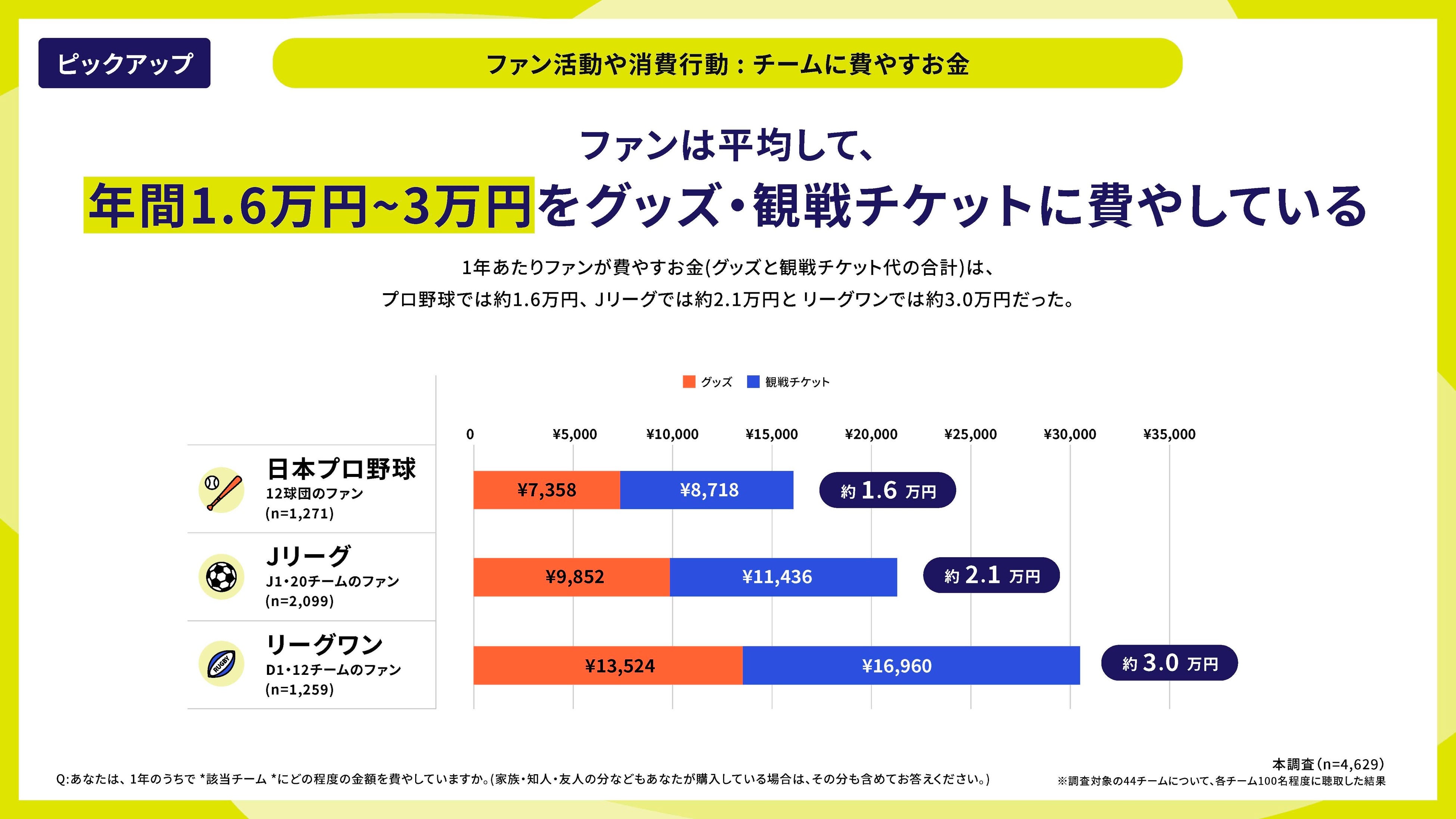 ファンは平均して、年間1.6万円~3万円をグッズ・観戦チケットに費やしている。