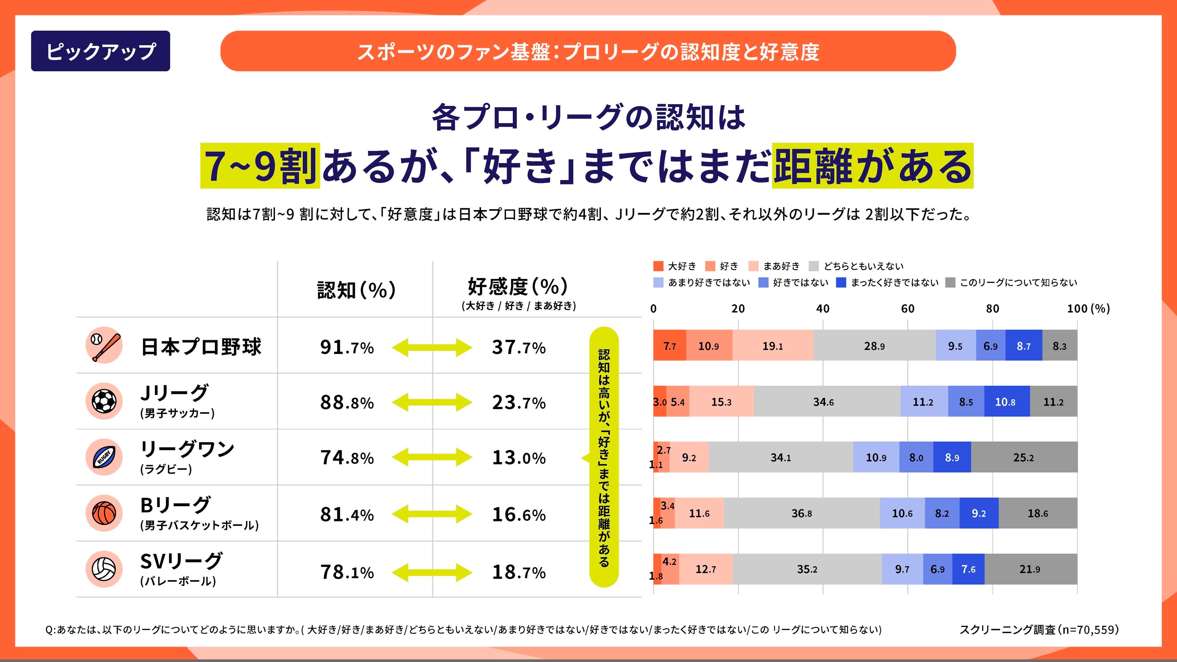 各プロ・リーグの認知率は7~9割あるが、「好き」まではまだ距離がある。