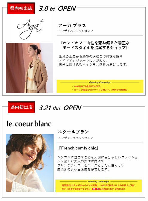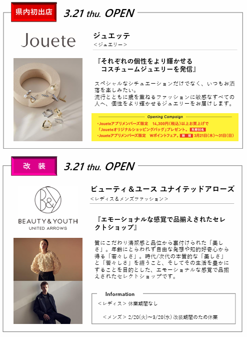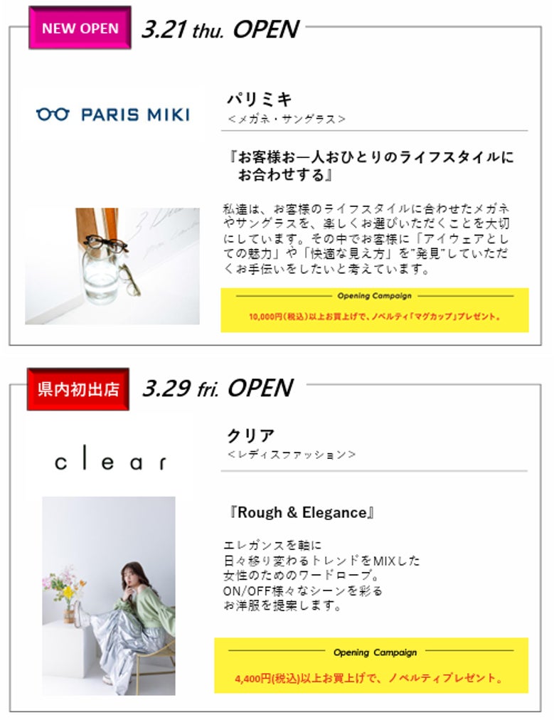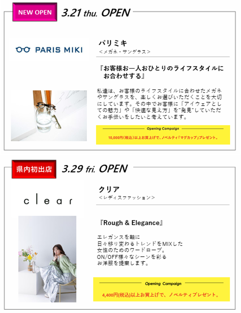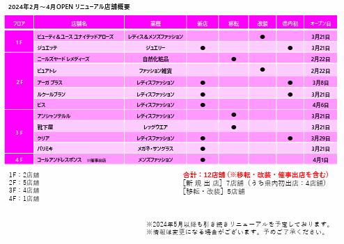 2021年以来となる大規模リニューアルで、今回はファッション・ファッション雑貨、雑貨店舗を中心にリニューアル(新規・移転・改装を含む)を行います。今回のリニューアルは、現在不足している業種・アイテムの導入、県内初出店のショップの誘致を行い、メインターゲット層(20~30代女性)の来館頻度・購買頻度UPに繋げていきます。