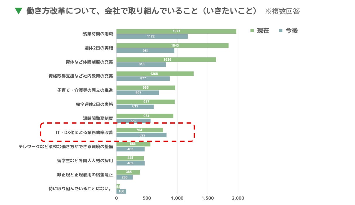 また、「IT・DX化による業務効率改善への取り組み」が「今後取り組んでいきたいこと」の第4位に入った。働き方改革を進めるうえで、IT・DX化による業務効率改善をすすめることへの期待感が感じられる結果となった。