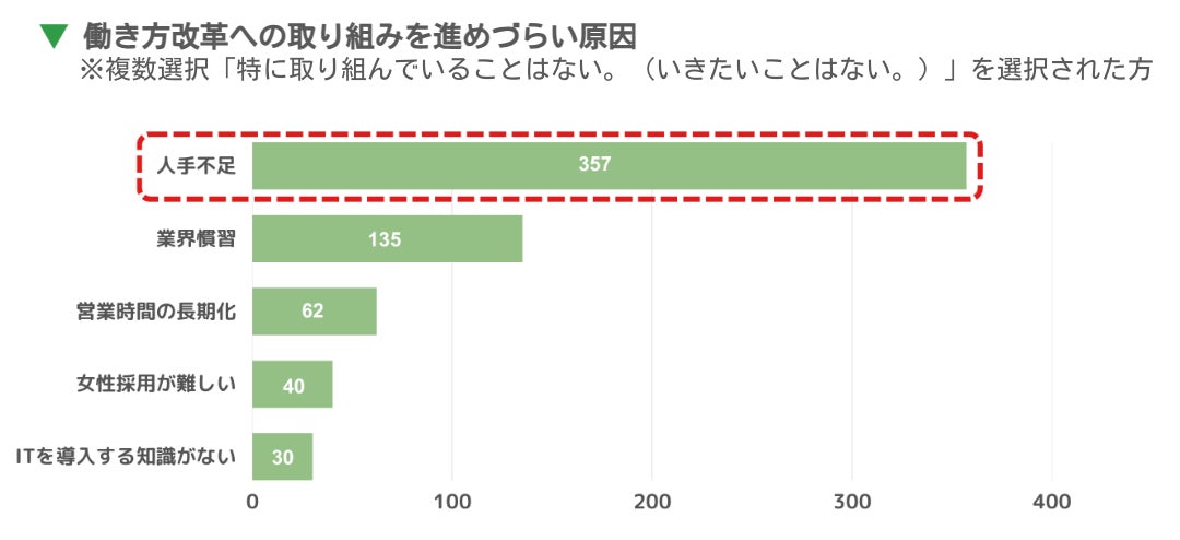 働き方改革への取り組みを進めづらい理由としては、昨年同様、人手不足と回答した企業が最も多かった。残業時間の削減・休日の確保を進めるためには、同時に人手を増やすことが求められる。採用と働き方改革は双方に大きく関与し、その両輪を回していく方法を模索する企業は多いと想定される。