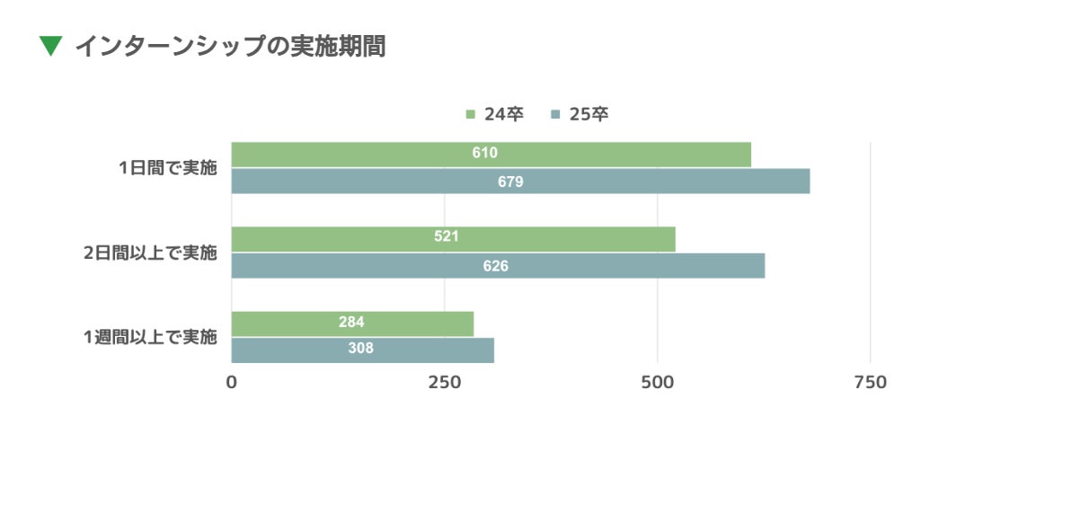 24卒・25卒ともに1週間以上のインターンシップを実施している企業は全体の約20%であった。