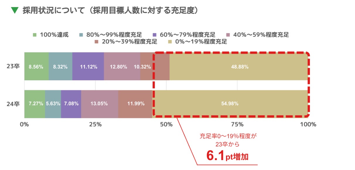 昨年の採用状況と比較すると、充足率80%以上の回答割合が3.98pt下がり、充足率20%未満の企業が6.1pt増加していることから、昨年に比較して採用に苦戦する企業が増えており、満足いく採用ができてないことがわかる。