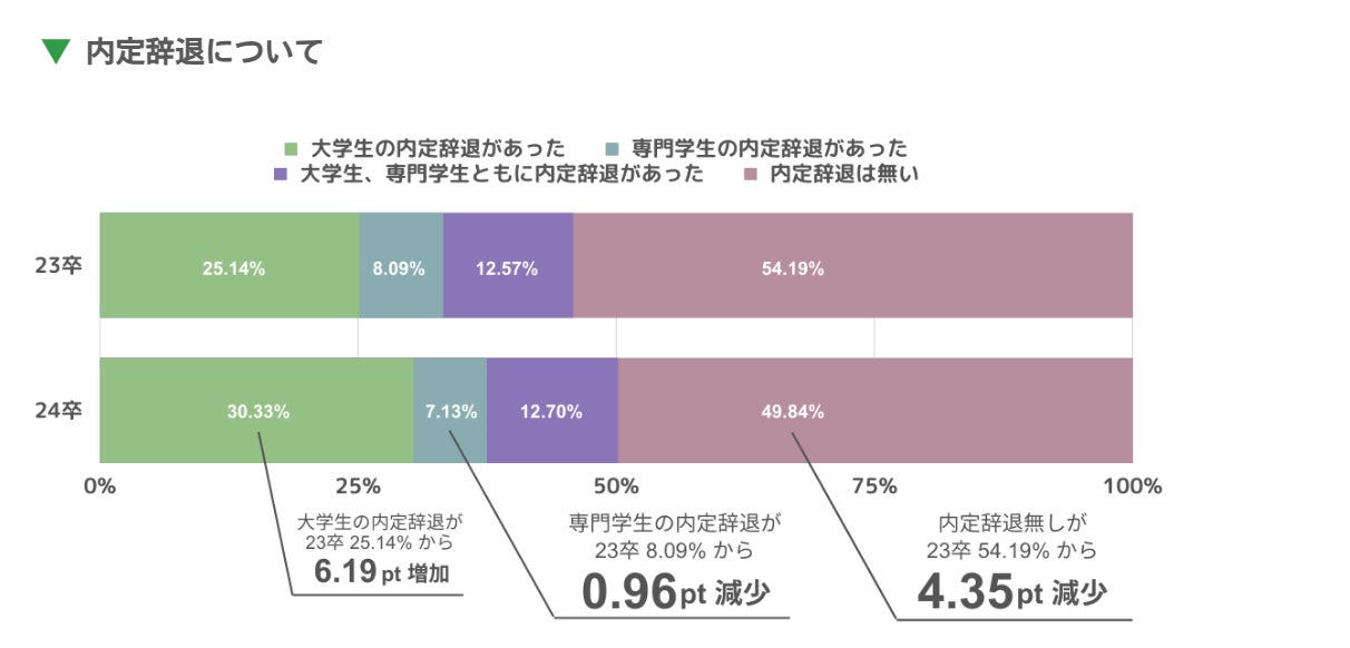 24卒の専門学生の内定辞退率は7.13%と低く安定。一方で大学生は30%超えに。 ”専門学生”採用活動の実態調査。