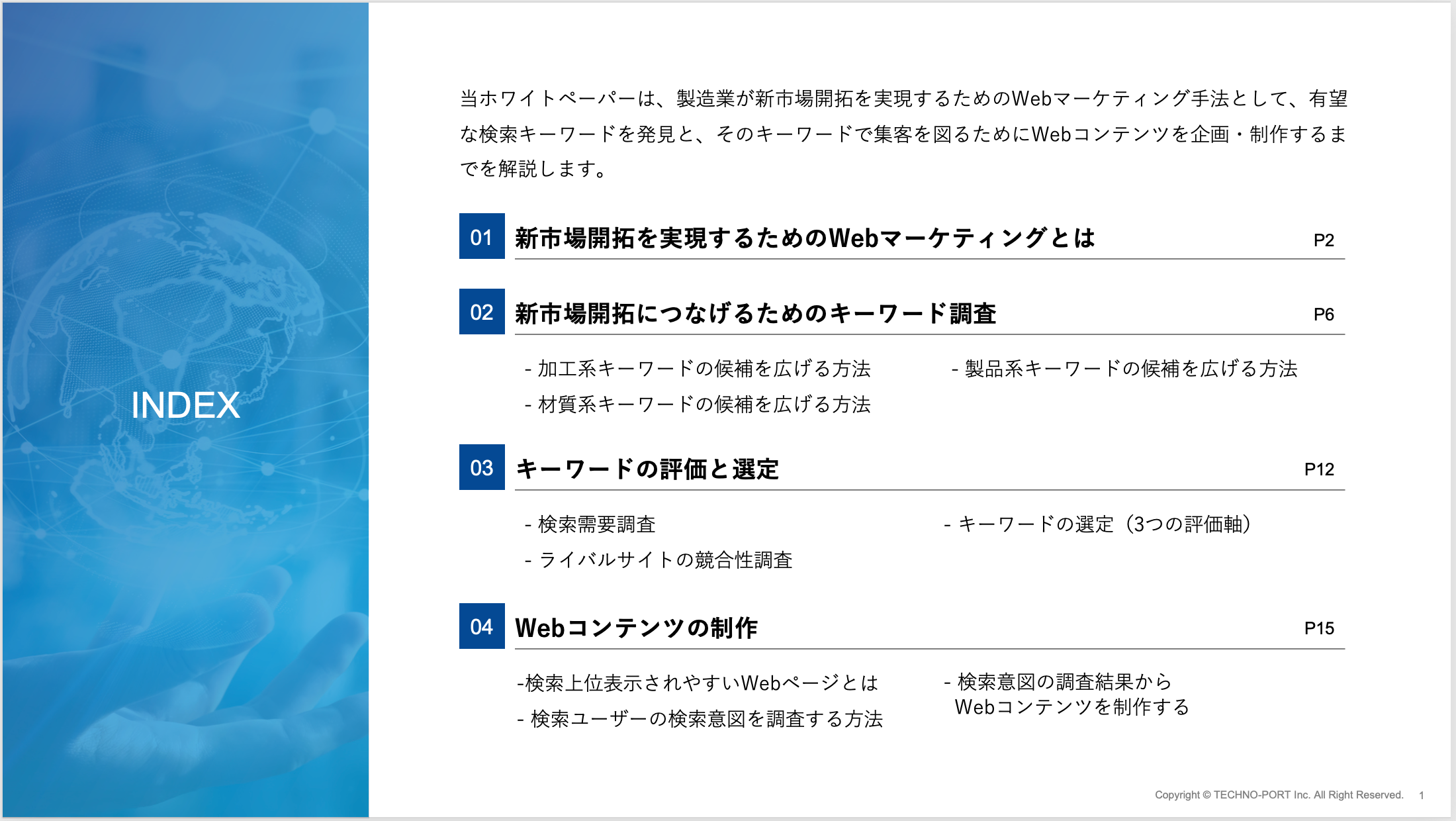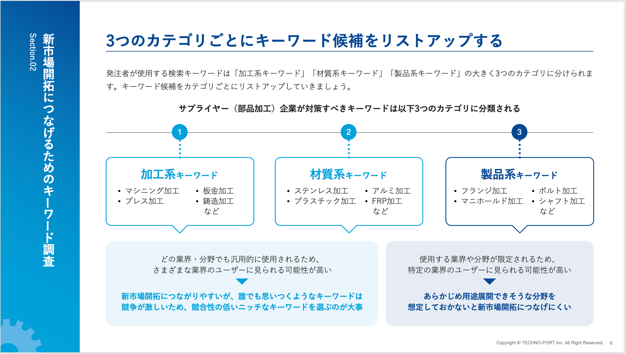 これらの結果を踏まえ、当社は長年の経験を基に、サプライヤー企業がWebマーケティングを利用して新市場を開拓するためのノウハウを集約した資料を作成しました。この資料を通じて、より多くの中小製造業が新たな市場開拓を実現できることを目指しています。