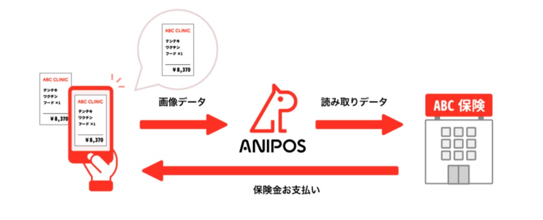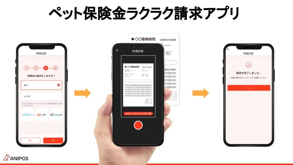 ペット保険金を簡単に請求できるスマホアプリ「アニポス」と、「アニポス」からシームレスに繋がるペット保険事業者の保険金支払い業務効率化サービス。