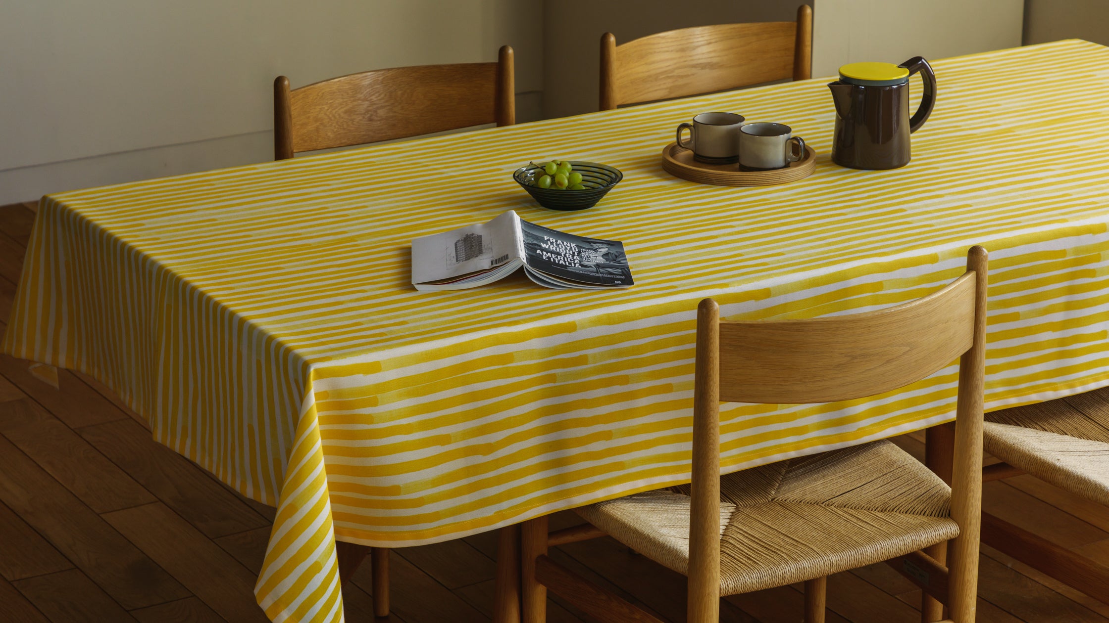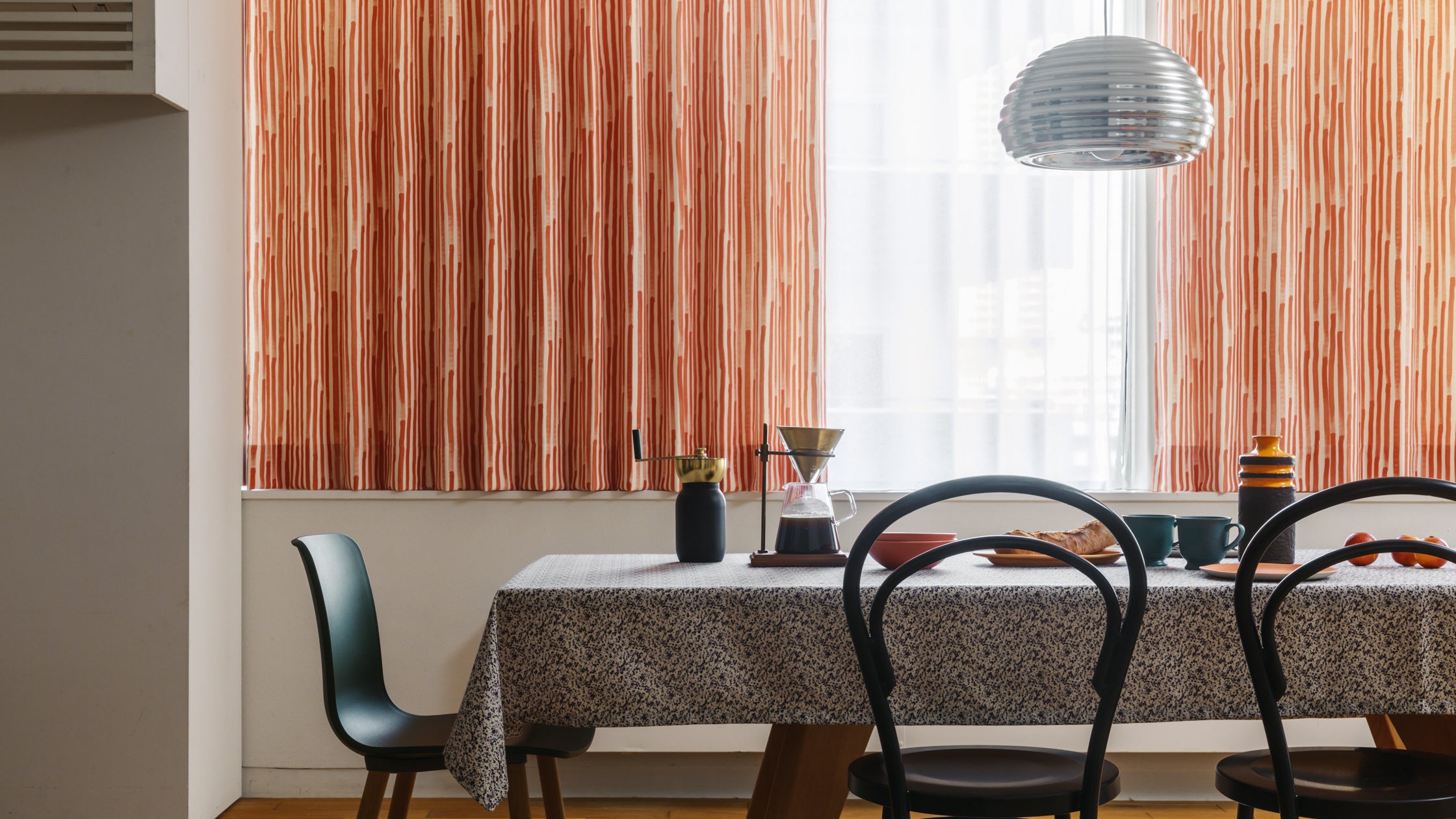 世界で活躍するデザイナーのデザイン性の高いデザインで、1cm単位で注文可能なオーダーカーテン、既製サイズから選べるクッションとテーブルクロス、そして100cm以上10cm単位にて生地をご注文いただけます。