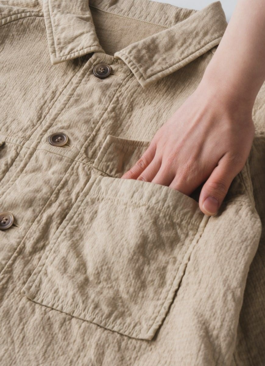 サステナブルなリサイクル糸「めぐりコットン®」を使用。表裏で織りが異なるダブルフェイスガーゼを使ったワークジャケットとステンカラーコート。ぽこぽことしたナチュラルなストレッチ性のある風合いで、空気をたくさん含んでいるのであたたかく、驚くほど軽い。ガーゼの良さをふんだんに感じられます。ボタンもサステナブルなエコテックス®認証のものを使用。