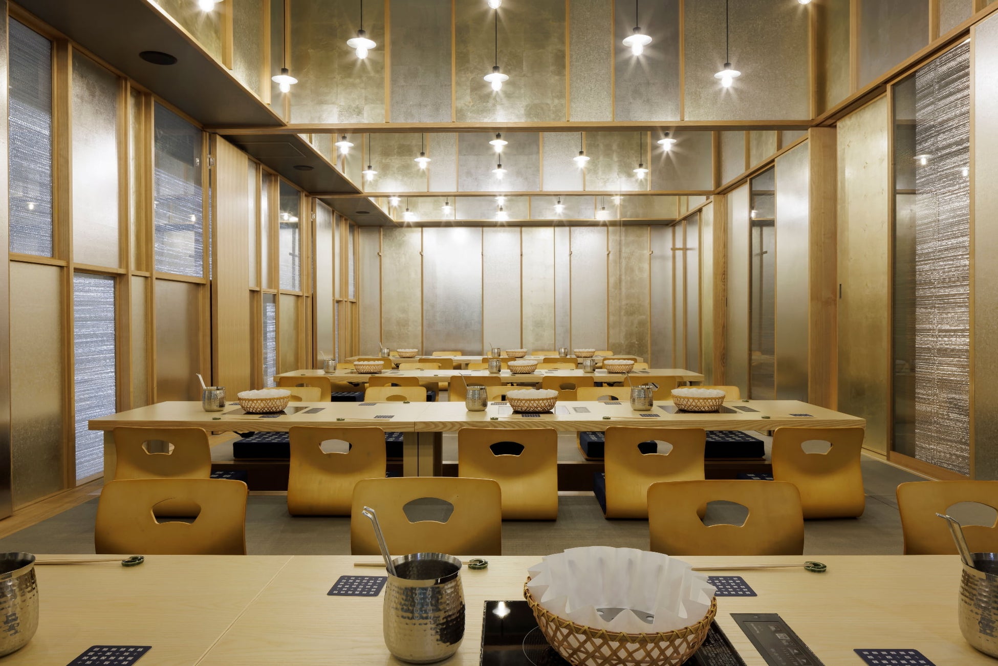 店内は伝統的な日本の美を受け継ぎながらも洗練されたデザインで、ゆったりとお寛ぎいただける上質な空間です。店内の2面が窓張りになっており、横浜店限定の景色が見える大人数用の個室や、窓に面したテーブル席・掘りごたつ席、最大40名様までご利用いただける大広間も完備しております。