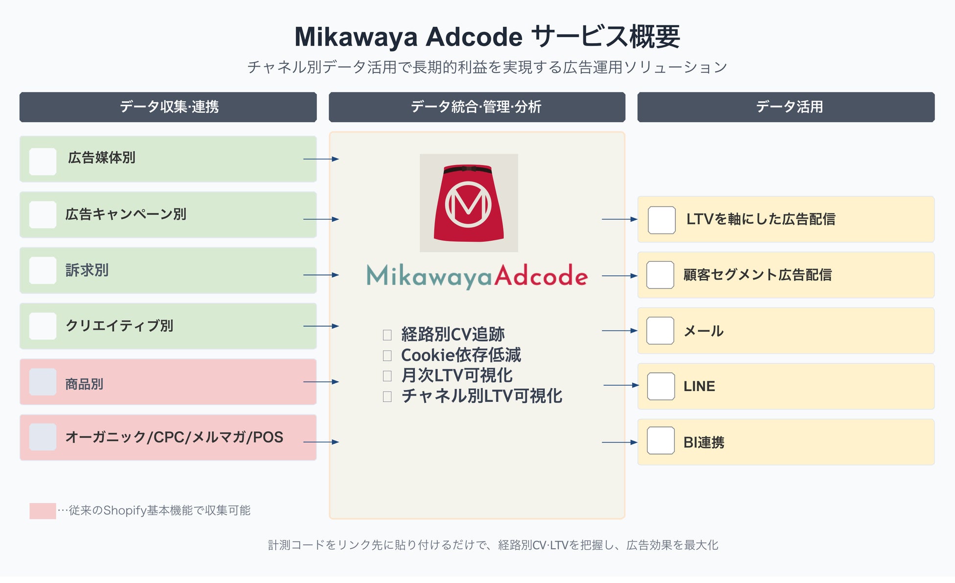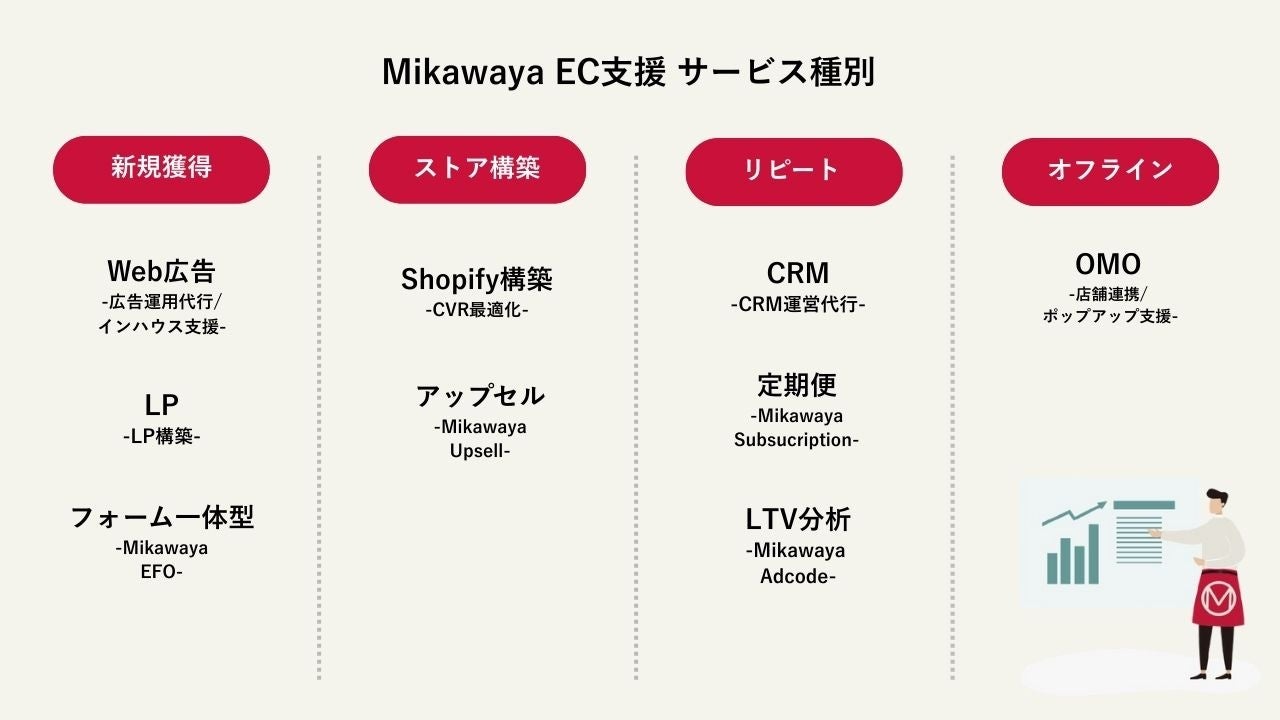 「Mikawaya」はAdcodeを含むあらゆる集客施策(新規獲得・ストア構築・データ分析・CRM)を網羅したワンストップソリューションです。