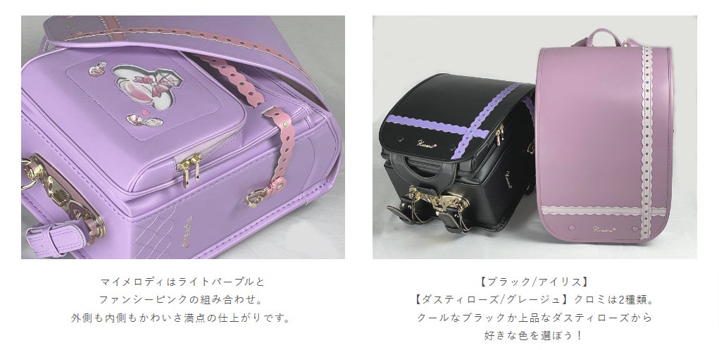 子供たちの笑顔を引き出す、「サンリオキャラクターズ(マイメロディ・クロミ)」をご紹介します。人気のマイメロディ1色とクロミ2色が新登場し、毎日の通学をもっと楽しく、心弾むものにします。高品質な素材と丁寧な仕上げで、安心して6年間ご使用いただけます。