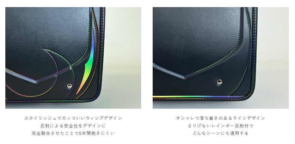 2種類のレインボー反射デザイン: ウィングデザインとラインデザインで、スタイリッシュさと安全性を両立。