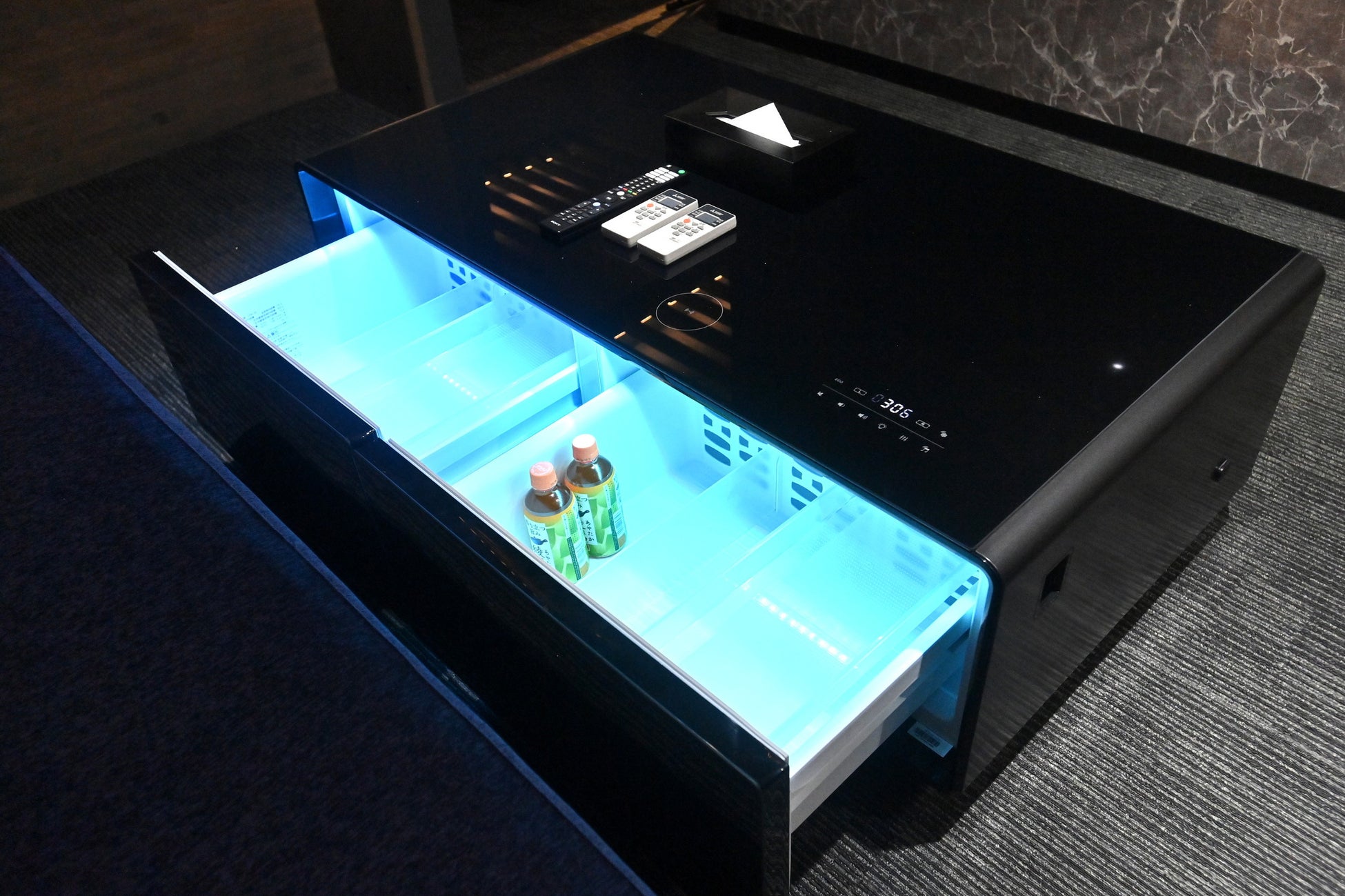 冷蔵庫,充電スタンド,スピーカーが内蔵された最新スマートテーブル