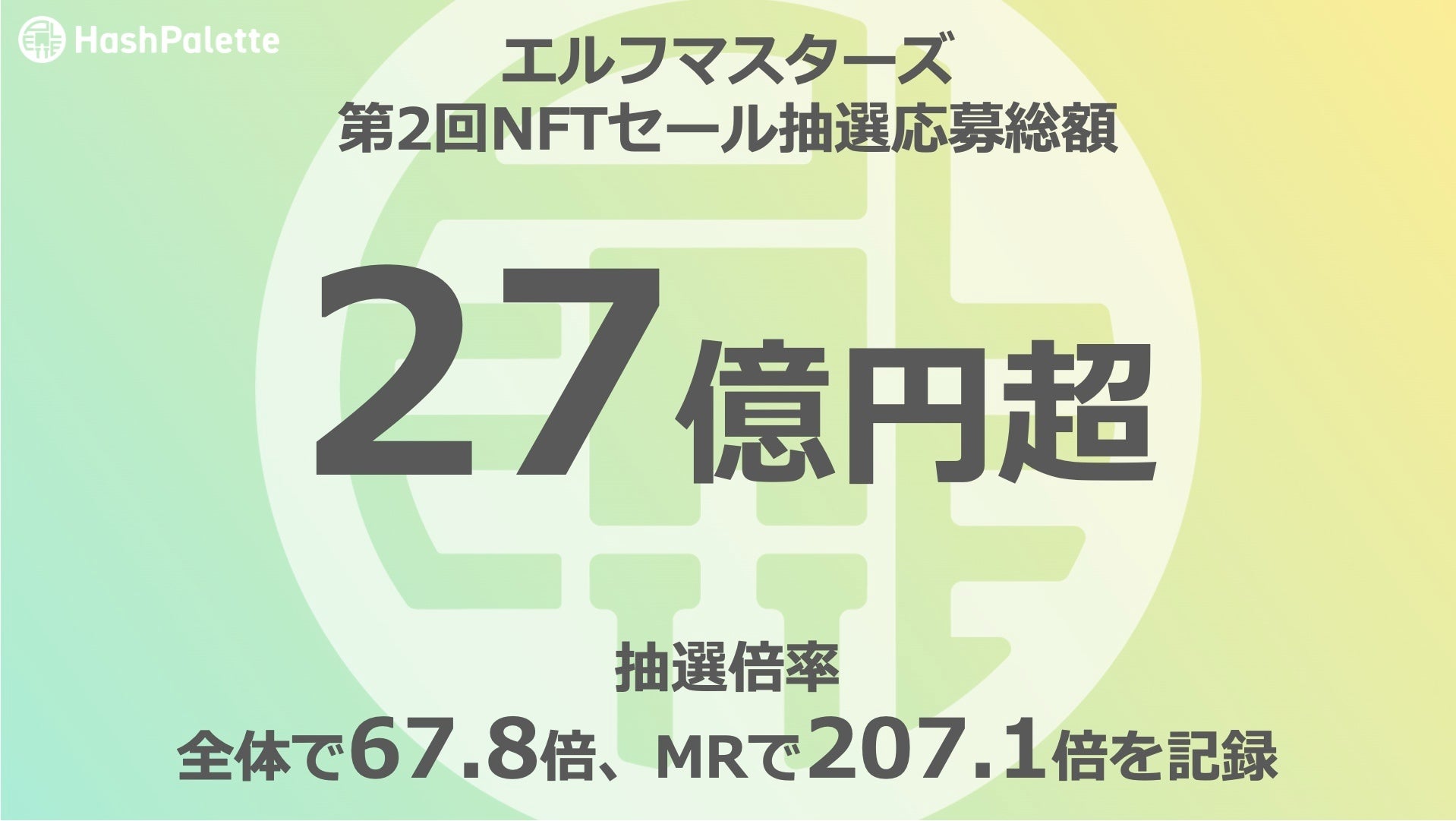 株式会社HashPalette (ハッシュパレット : 本社東京都港区、代表取締役CEO : 吉田世博、以下HashPalette)が開発・提供する、Play to Earn型ブロックチェーンゲーム「エルフマスターズ」のゲームNFTスターターパックの第二回セールを、パレット公式マーケットプレイス「PLT Place」で抽選形式で実施しました。抽選申込終了時には応募総額が27億円を突破し、応募金額ベースの抽選倍率は全体で67.8倍、MRでは207.1倍を記録したことをお知らせします。