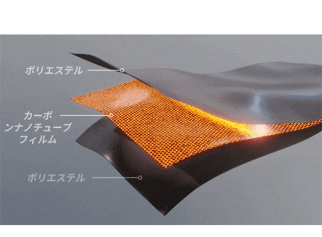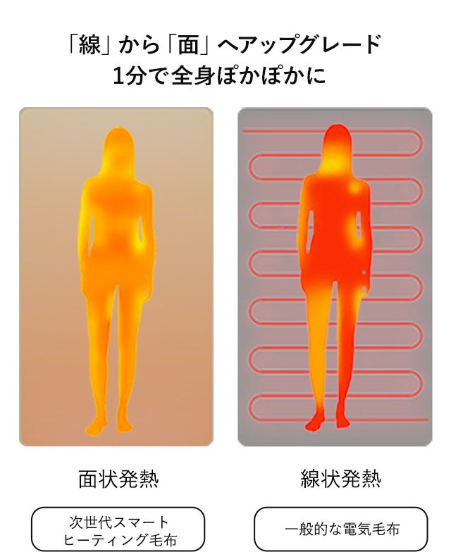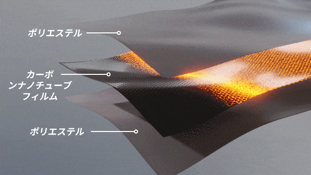 一方、「次世代スマートヒーリング毛布2.0」の場合、電熱線に変わるカーボンナノチューブフィルム(CNT)を採用。電流が面そのものに流れるので、広範囲にわたって「面」で発熱し、すぐに体全体が温まる仕組みとなっております。