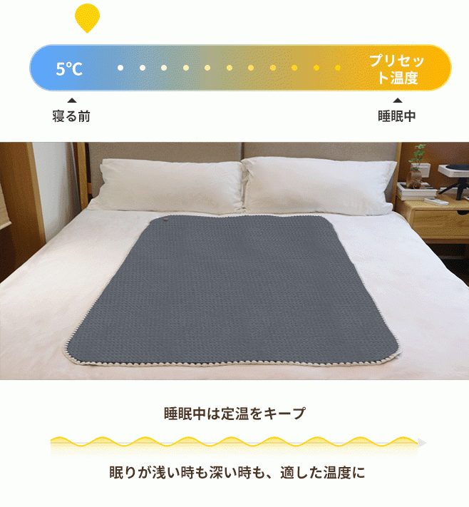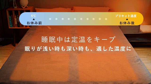 スマート温度制御モードでは、入眠時に温度を上昇させ、睡眠中に定温をキープし、眠りが浅い時も深い時も、0.1℃単位で最適な温度に自動調節し続けるスマートさにより、布団では実現できない快適な眠りへと導きます。