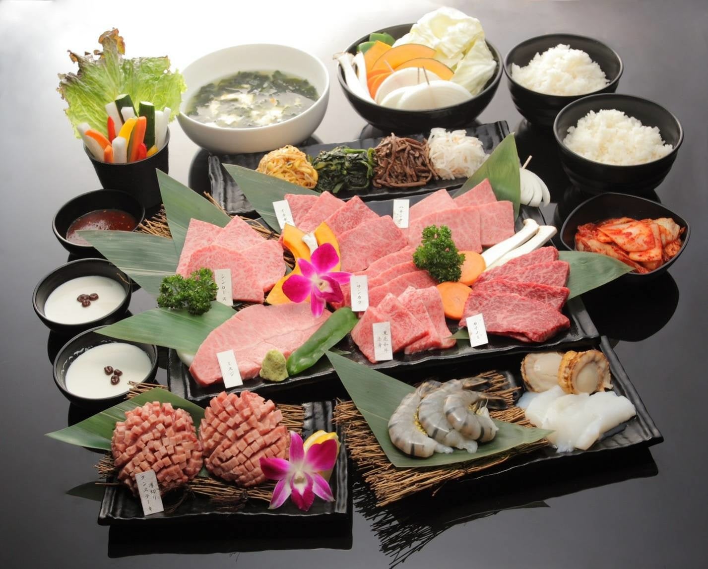 食べるラー油/ナムル4種盛/キムチ2盛(白菜キムチお替り自由)/七つ星パリパリサラダ(お替り自由)/牛タン塩/黒毛和牛 1/黒毛和牛 2/黒毛和牛 3/黒毛和牛 4/黒毛和牛 5/マルチョウ/ウインナー/海鮮盛/銀しゃり(お替り自由)/わかめスープ/デザート