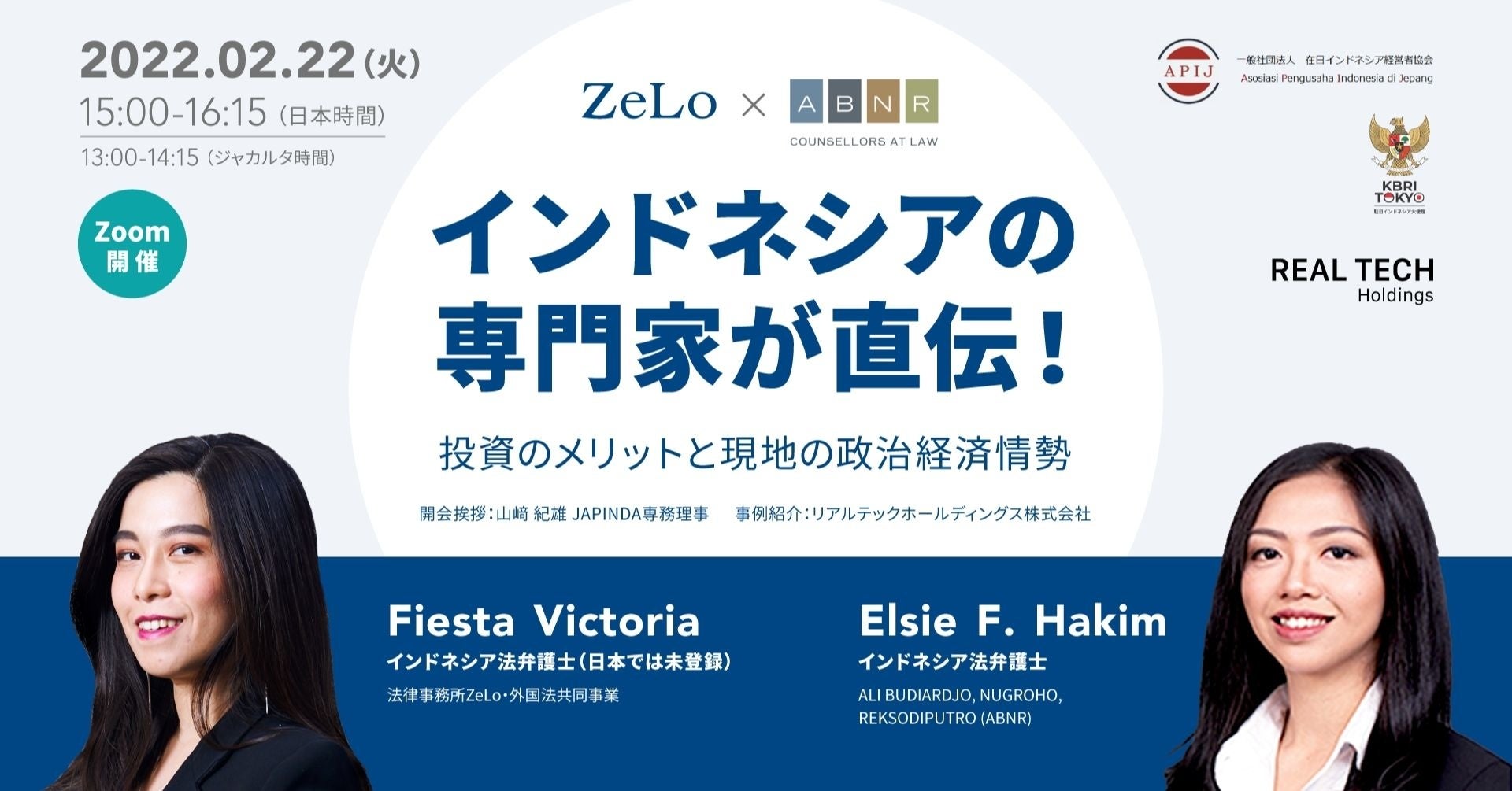 We, ZeLo, a Foreign Law Joint Enterprise (located in Koto-city, Tokyo, representative attorney; Masataka Ogasawara. “ZeLo”), proudly announce that on February 22, 2022 we will host a joint webinar, “INDONESIA: PROMISING INVESTMENT DESTINATION? (Online Discussion: Benefits, Opportunities, and Challenges)”, with Elsie F. Hakim, an attorney-at-law admitted in Indonesia of ALI BUDIARDJO, NUGROHO, REKSODIPUTRO (“ABNR”), a leading law firm in Jakarta, Indonesia.
