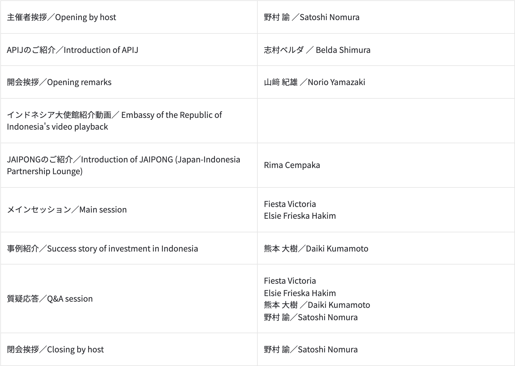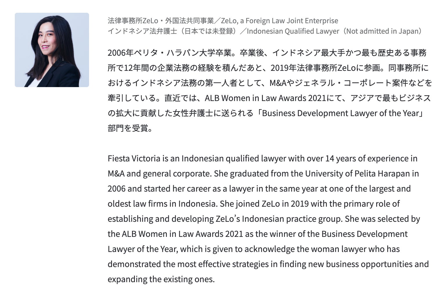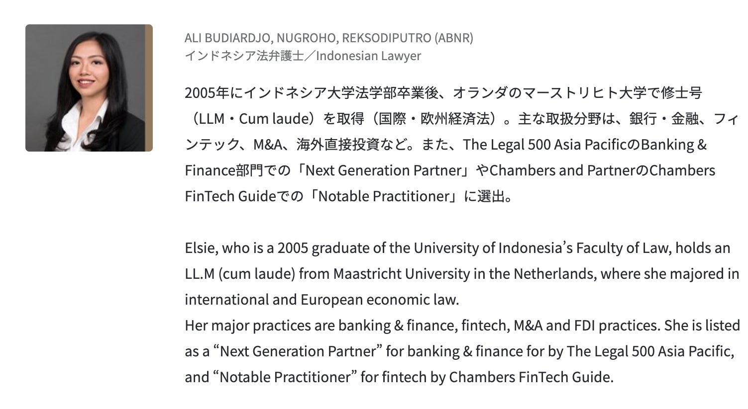 The speaker is Fiesta Victoria, an Indonesian qualified lawyer (not admitted in Japan), who has more than 10 years of experience at the leading law firm in Jakarta. The main speaker from Jakarta is Ms. Elsie F. Hakim, an Indonesian qualified lawyer (not admitted in Japan) from a leading law firm in Jakarta, ALI BUDIARDJO, NUGROHO, REKSODIPUTRO (ABNR).