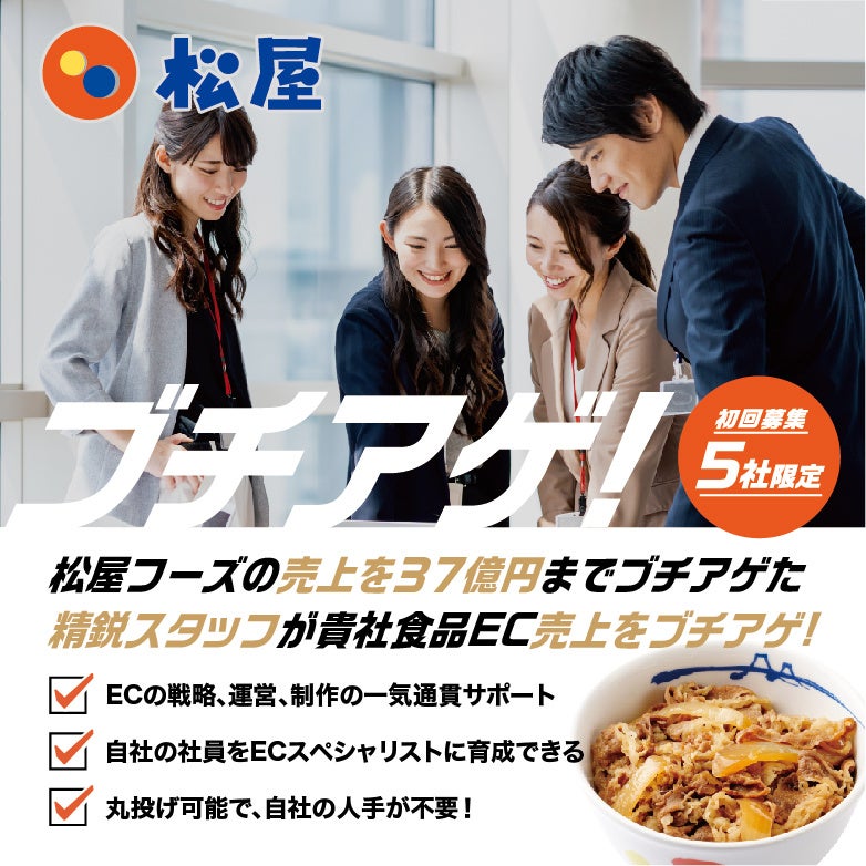 牛丼外食チェーンの株式会社松屋フーズ(本社 東京都三鷹市 代表取締役 瓦葺一利)は、食品に特化したECコンサルティング&運営代行事業「ブチアゲ!」を始めることを発表した。