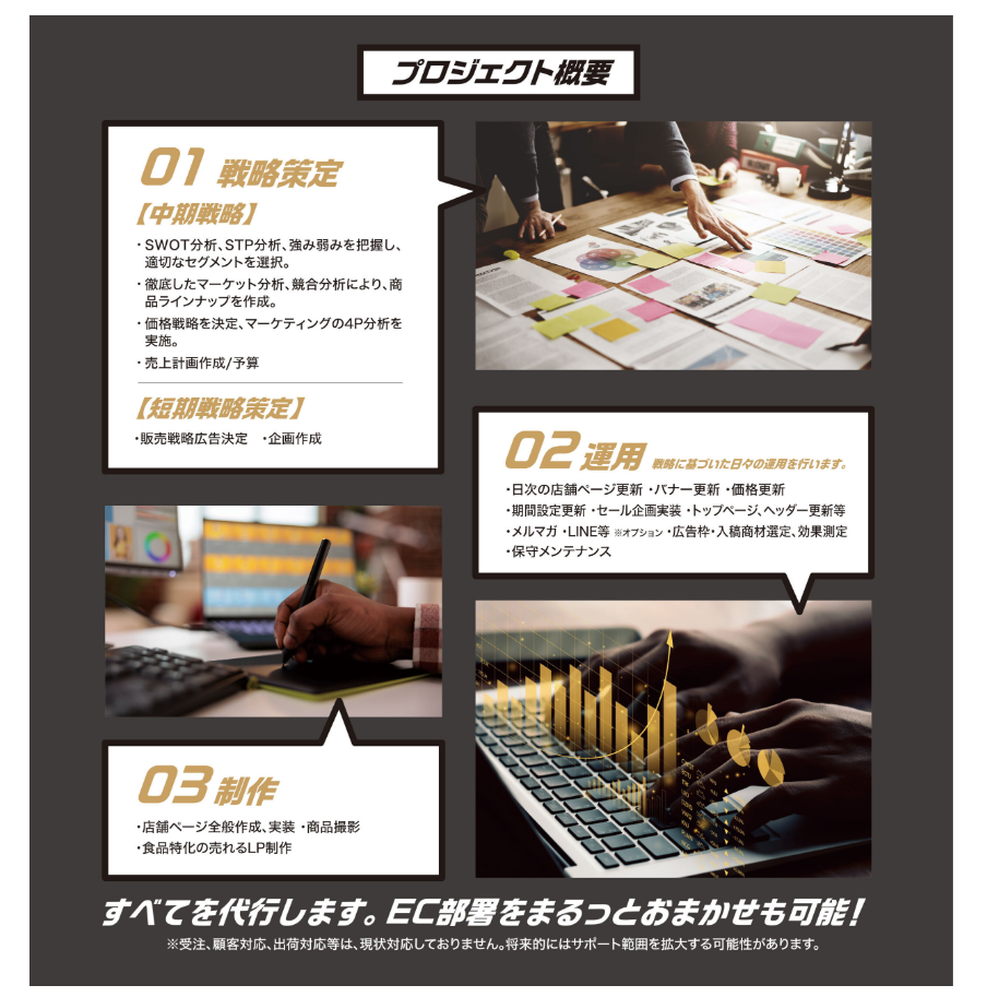 本事業「ブチアゲ!」は、クライアントの売上を文字通り「ぶち上げ」ることを目的とし、EC業務の戦略から運営、制作まで一気通貫でサポートしている。クライアントの「丸投げしたい」という需要に答えた形となる。