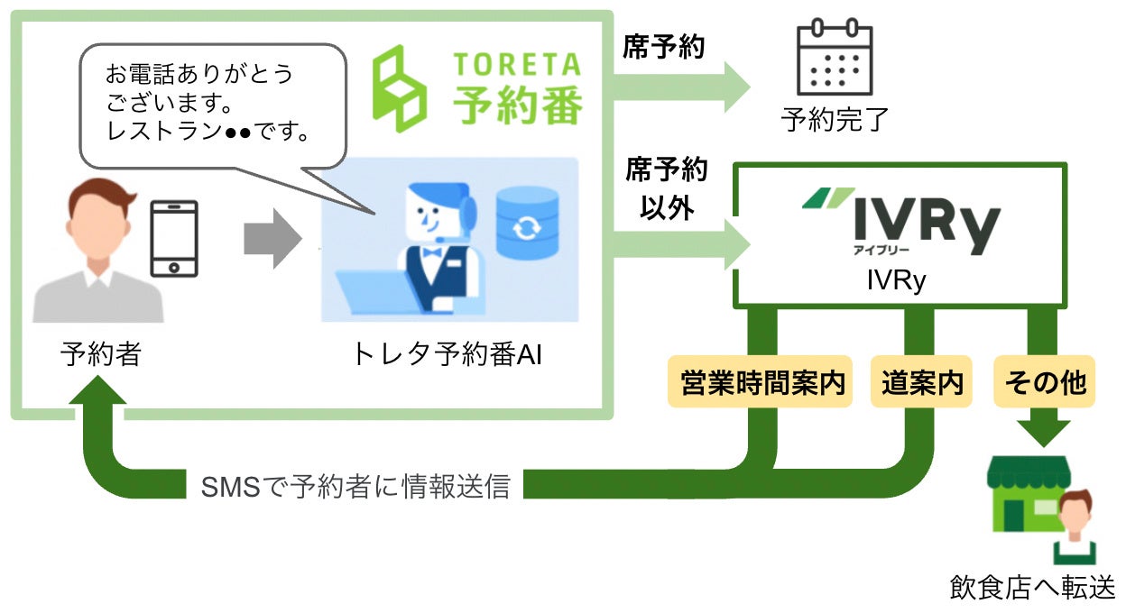 予約者からの電話を「トレタ予約番」のAIが自動で24時間365日対応します。AIは予約者との自然な会話で新規の席予約を受け付けます。また、予約者が営業時間の確認や道案内を希望する場合は「IVRy」に転送し、希望の情報を予約者にSMSで送信します。飲食店に転送設定することも可能ですので、必要とするお客さまにはより丁寧な対応も提供できます。
