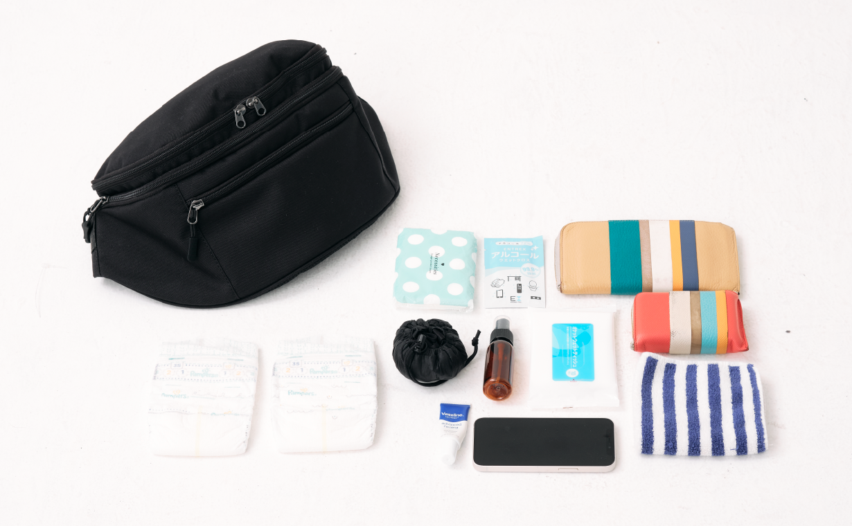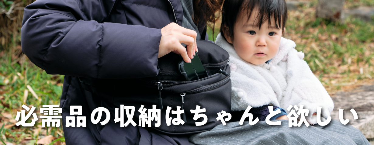 バッグ研究家がモニターさんと一緒に、いろいろなシーンを想定し、改良を重ねること1年。コンパクトにまとまりつつ、しっかりと安心してお子さんを抱くことのできるウエストポーチが出来上がりました。