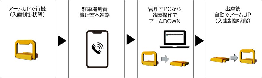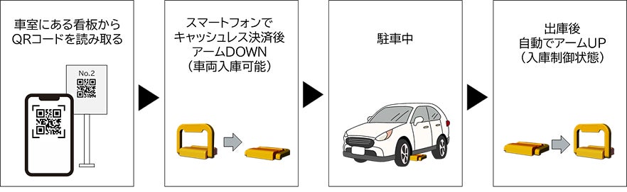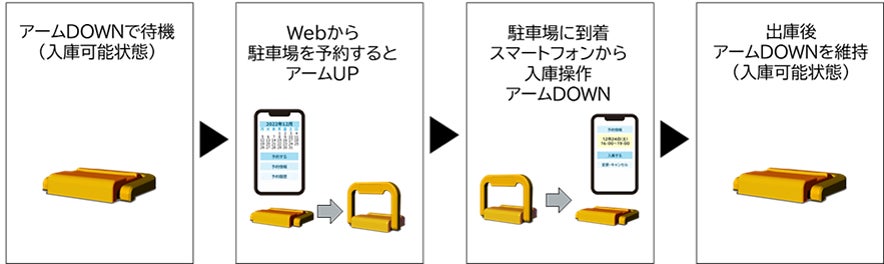 アプリと連携し、車室にそれぞれ設置した本体端末のアームが立ち上がることにより、入庫を「デジタル制御」するもので、以下のような使い方ができます。