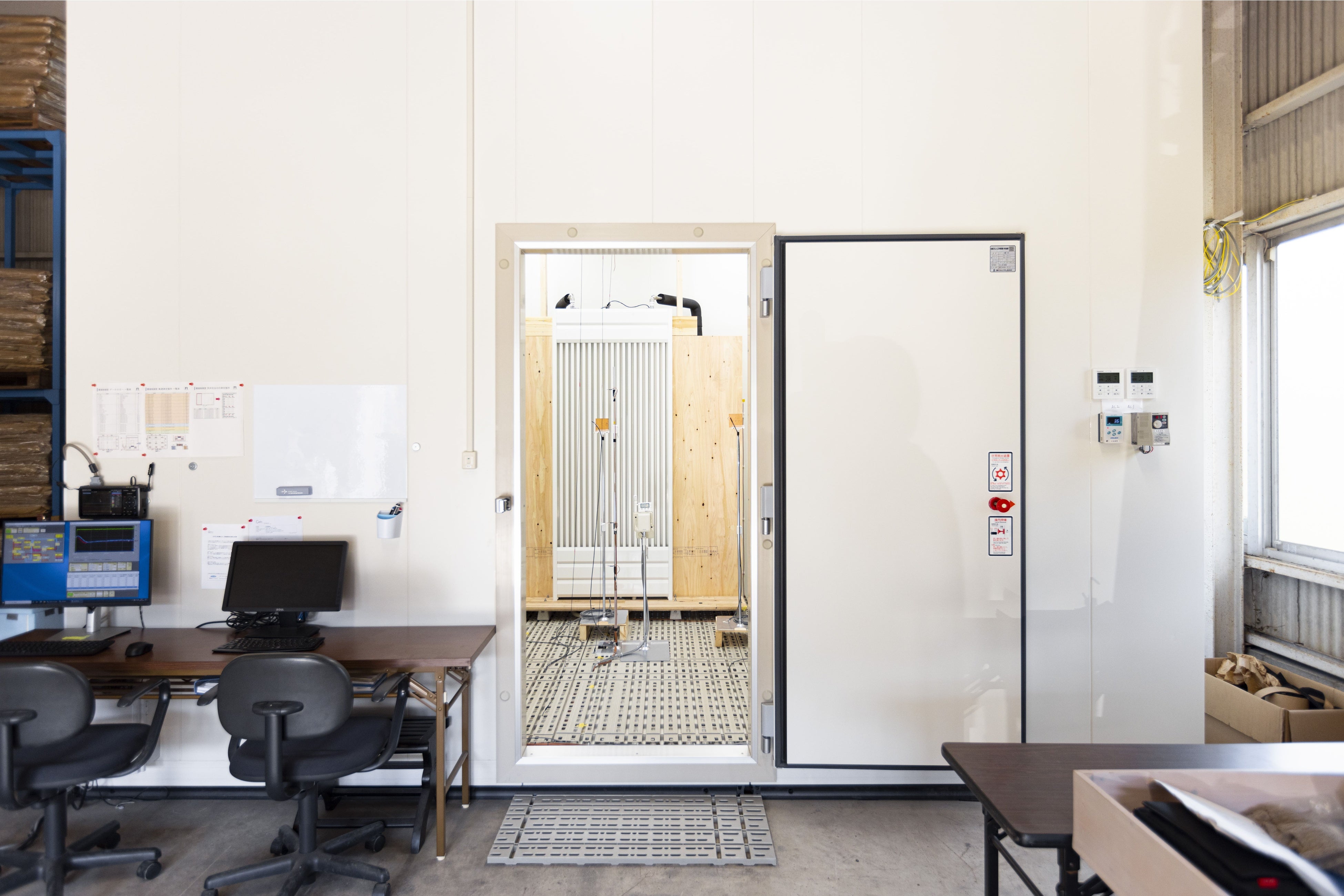 「実際に試して確信を持ったものだけを提供する」というポリシーのもと、設計・施工・使い方・研究・開発のノウハウを積み重ねるため、同社では自社環境試験室を完備した実験施設を保有しています。輻射パネルの評価実験には、パネルの入る大きな試験室や循環水の温度を保つ特殊な設備、また水温や室温を様々に変化させて環境変化の数値を取得するための長い日数、などを要します。既存の外部試験室では、諸条件や期限によって実験が制限されてしまい十分な性能評価を行えない可能性もありますが、自社の実験環境を整備・強化したことで、正確かつ実環境に合わせた性能評価実験を行うことが可能です。