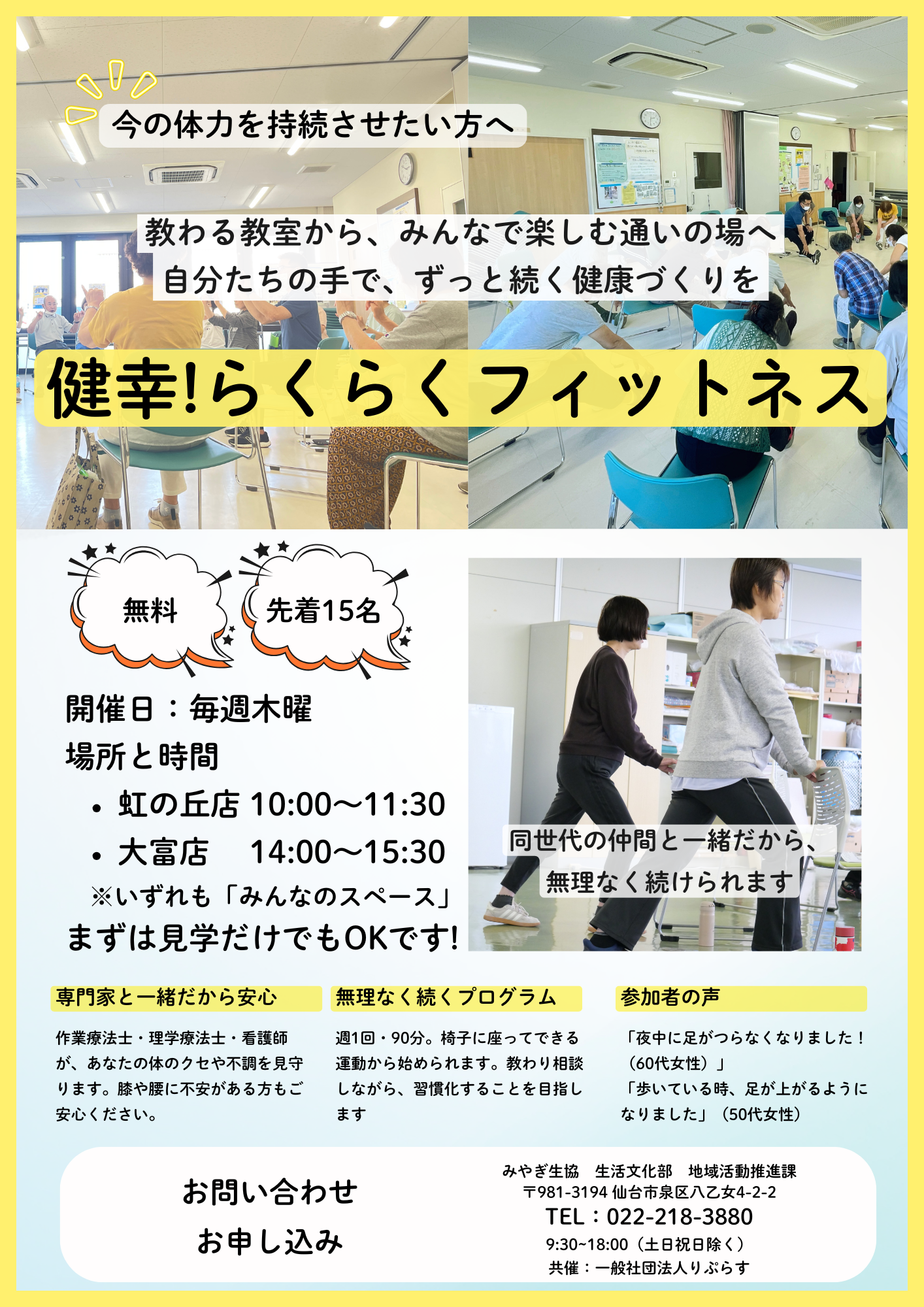 一般社団法人りぷらす(宮城県石巻市、代表理事:橋本大吾)は、みやぎ生活協同組合(本部:宮城県仙台市、代表理事理事長:冬木 勝仁)との協働により、専門職と一緒に作り上げていく健康教室「健幸!らくらくフィットネス」の2026年度プログラムを、5月7日(木)より虹の丘店、大冨店の2店舗にて開始いたします。
