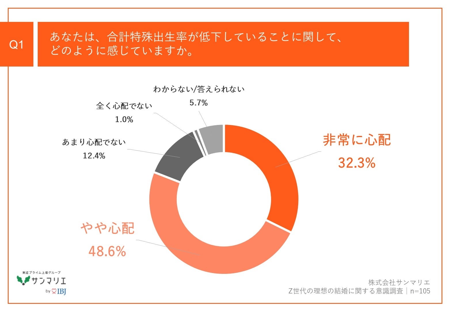 「Q1.あなたは、合計特殊出生率が低下していることに関して、どのように感じていますか。」(n=105)と質問したところ、「非常に心配」が32.3%、「やや心配」が48.6%という回答となりました。