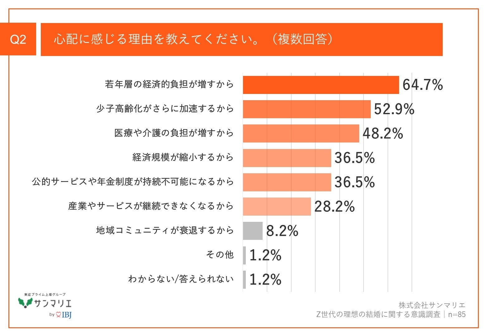 Q1で「非常に心配」「やや心配」と回答した方に、「Q2.心配に感じる理由を教えてください。(複数回答)」(n=85)と質問したところ、「若年層の経済的負担が増すから」が64.7%、「少子高齢化がさらに加速するから」が52.9%、「医療や介護の負担が増すから」が48.2%という回答となりました。