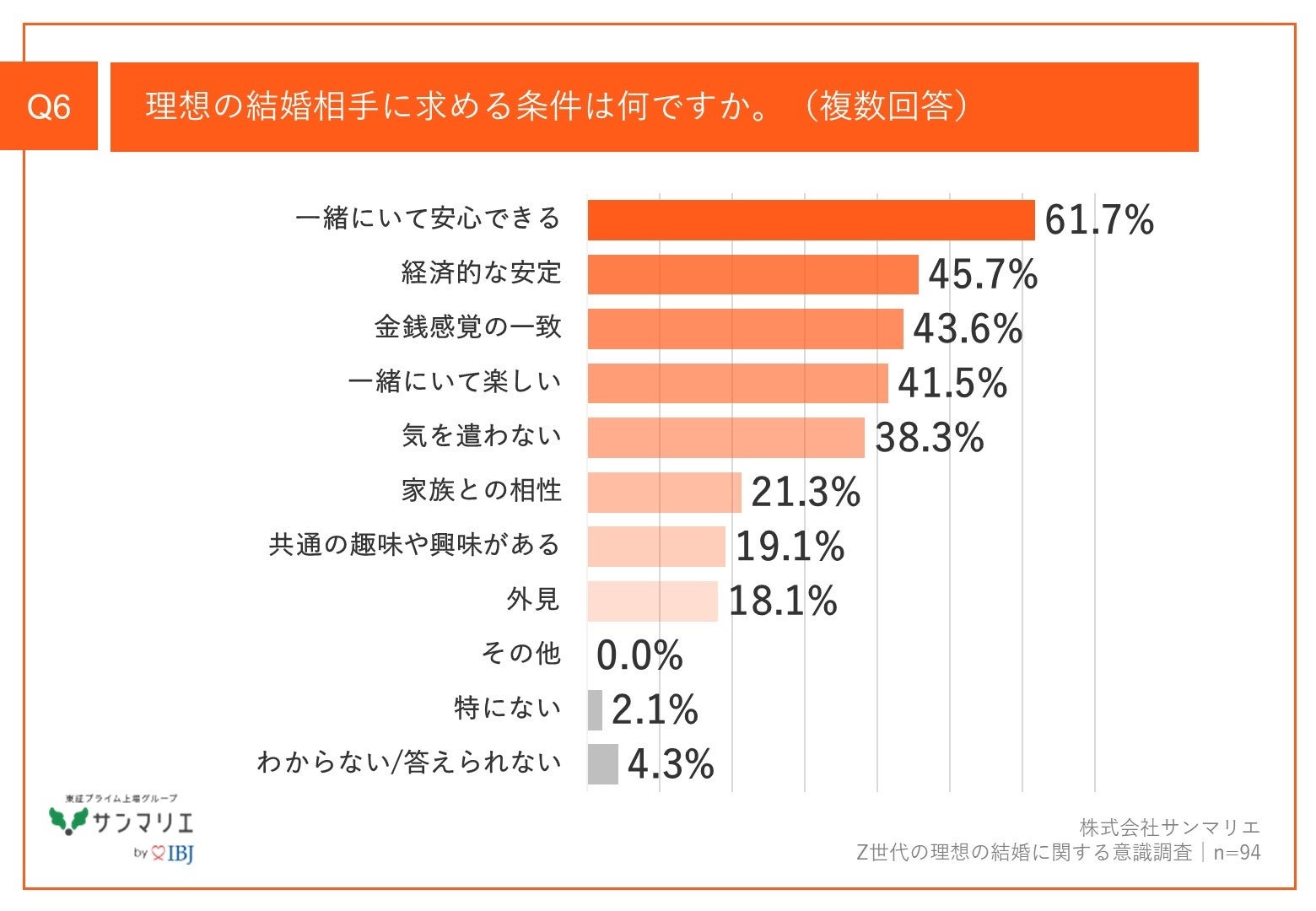 Q5で「結婚したくない」以外を回答した方に、「Q6.理想の結婚相手に求める条件は何ですか。(複数回答)」(n=94)と質問したところ、「一緒にいて安心できる」が61.7%、「経済的な安定」が45.7%、「金銭感覚の一致」が43.6%という回答となりました。