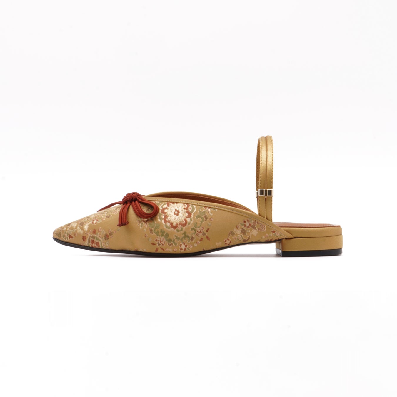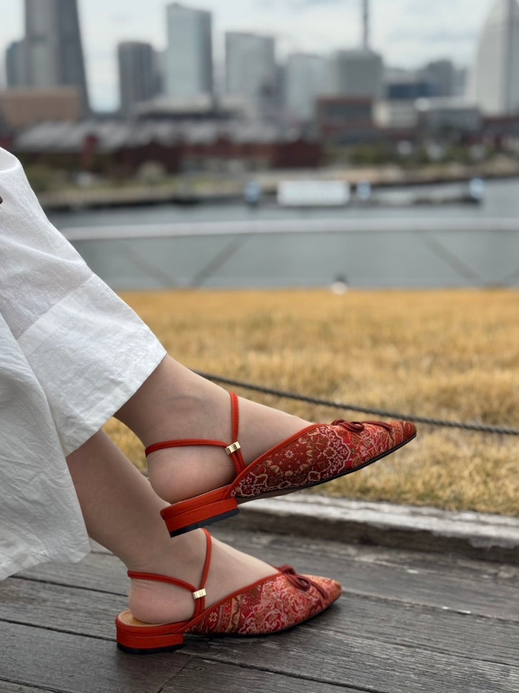 着物を着る機会が少なくなった現代では、使われることなく眠っている美しい着物や帯が溢れています。「カタチ」を変えることでもっと身近に取り入れてもらいたい、商品を通して日本の伝統文化に触れるきっかけになってほしいと考え、現在はレディースシューズをメインにスカートなどのアイテムを展開しています。シューズでは桐たんすで着物や帯を保管するという昔からの日本の文化にちなんで、商品はブランドネームの焼印が入った桐箱もオプションとしてご準備しています。