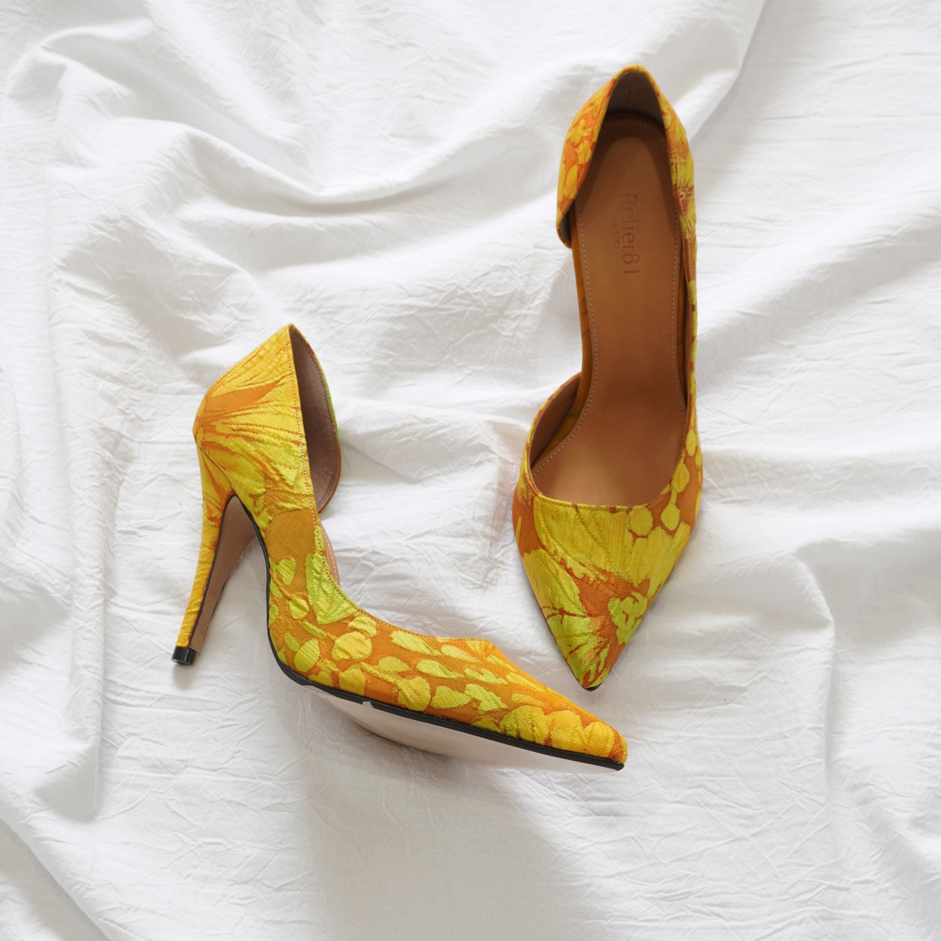 全体に着物や帯を使用した華やかなハイヒールパンプス。