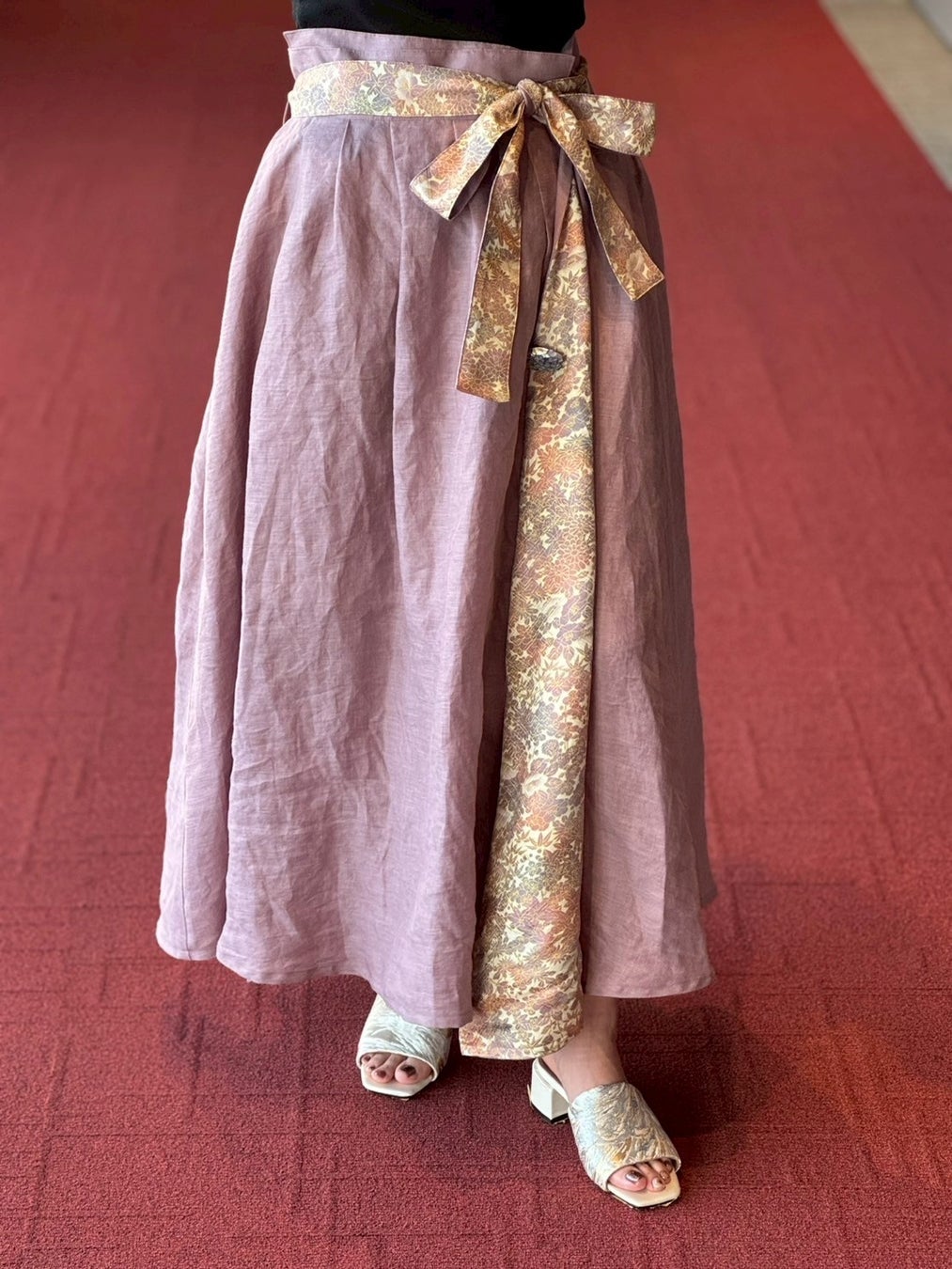新作として登場するラップスカートは、リネン素材をベースに、着物のエッセンスをさりげなく取り入れた華やかな一着。使用する着物や帯により異なる表情を持つ、世界にひとつだけの一点ものアイテムが揃います。