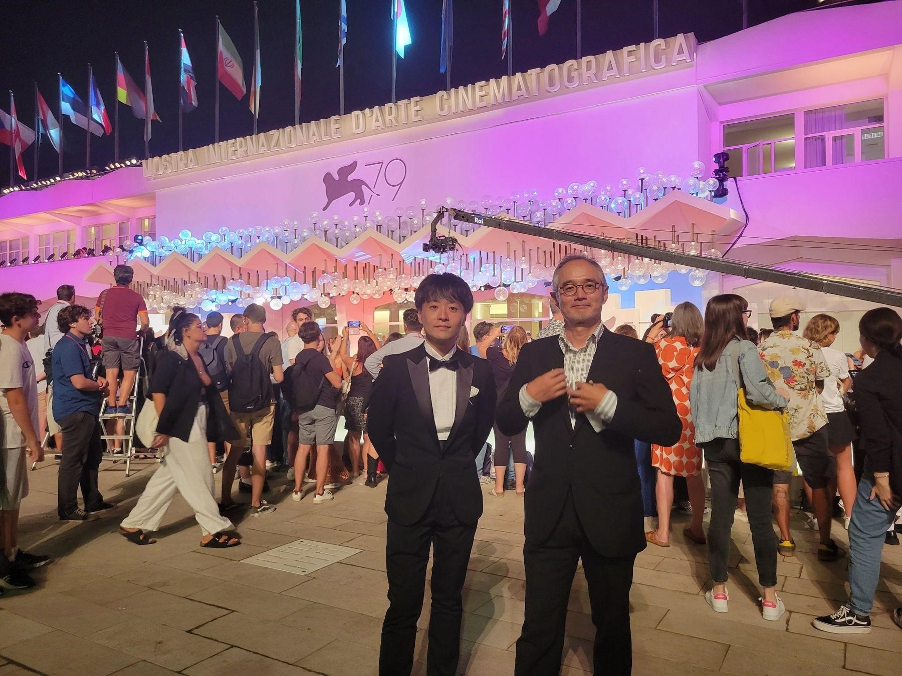 写真はベネチア国際映画祭2022上映ブーストとレッドカーペット後の作道監督(左)と石丸プロデューサー(右)