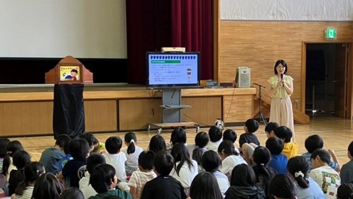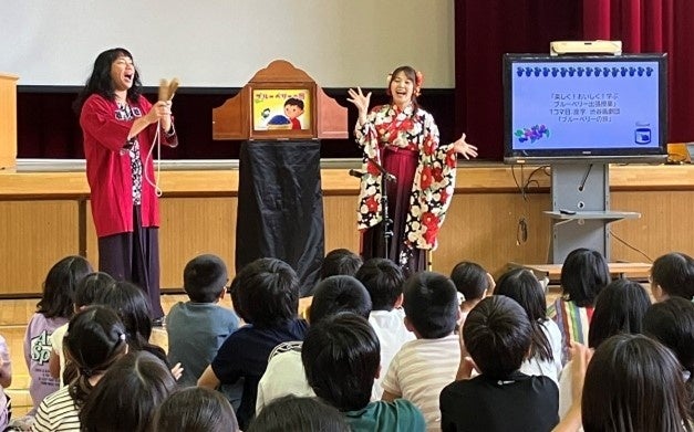 続いて管理栄養士である清水加奈子さんが登壇。果物の栄養価について、またブルーベリーについて講義しました。講義中、ブルーベリーが好きかと尋ねられた生徒たちは「好き~!」と返答し、盛り上がりを見せました。その後、プロの紙芝居師である渋谷画劇団が登場し、紙芝居「ブルーベリーの旅」を披露。紙芝居中もクイズや生徒たちとやり取りを行いながら楽しくブルーベリーについて学びました。