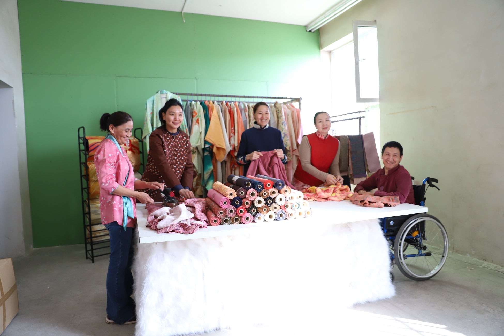 生まれつき障がいを抱え(下半身脊髄麻痺)車いす生活ビャンバーの夢:この仕事をして、初めて「社会の一員として生きること」へ喜びを感じ、自分に自信がつきました。お客様が大切にされていたお着物を活かし、反物の製造だけでなく、障がいのある方へ手に職をつけ自立に向かうチャンスとなり、日本の素敵な伝統を世界に広めるこの取り組みの一員になれたことが誇りです。着物deお針子をご利用くださるお客様へ、私は今が一番幸せであることを伝えたいです。そしてこのお仕事に携わってから、人生で初めて夢を持つことが出来ました。それは世界中の障がいを抱える方々へ、夢と希望をあたえられる存在になりたいということです。