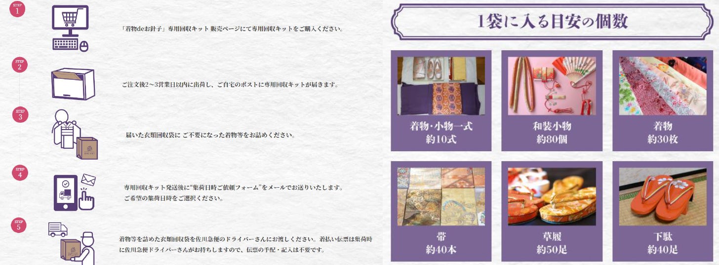 ご家庭でご不要になった着物等を簡単便利に手放すことができる自立支援型・寄付つきお片づけ商品です。