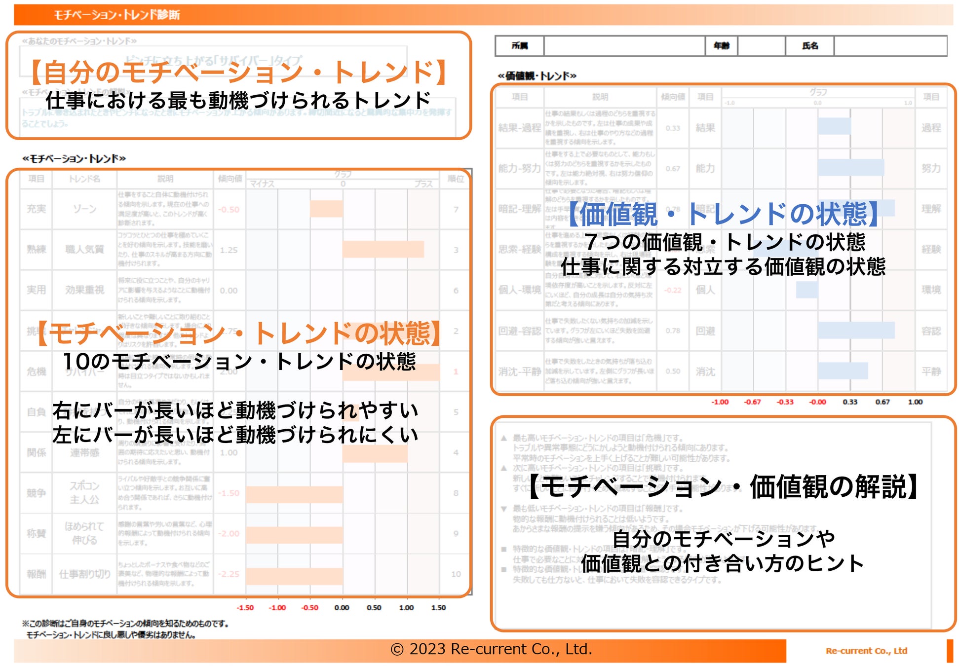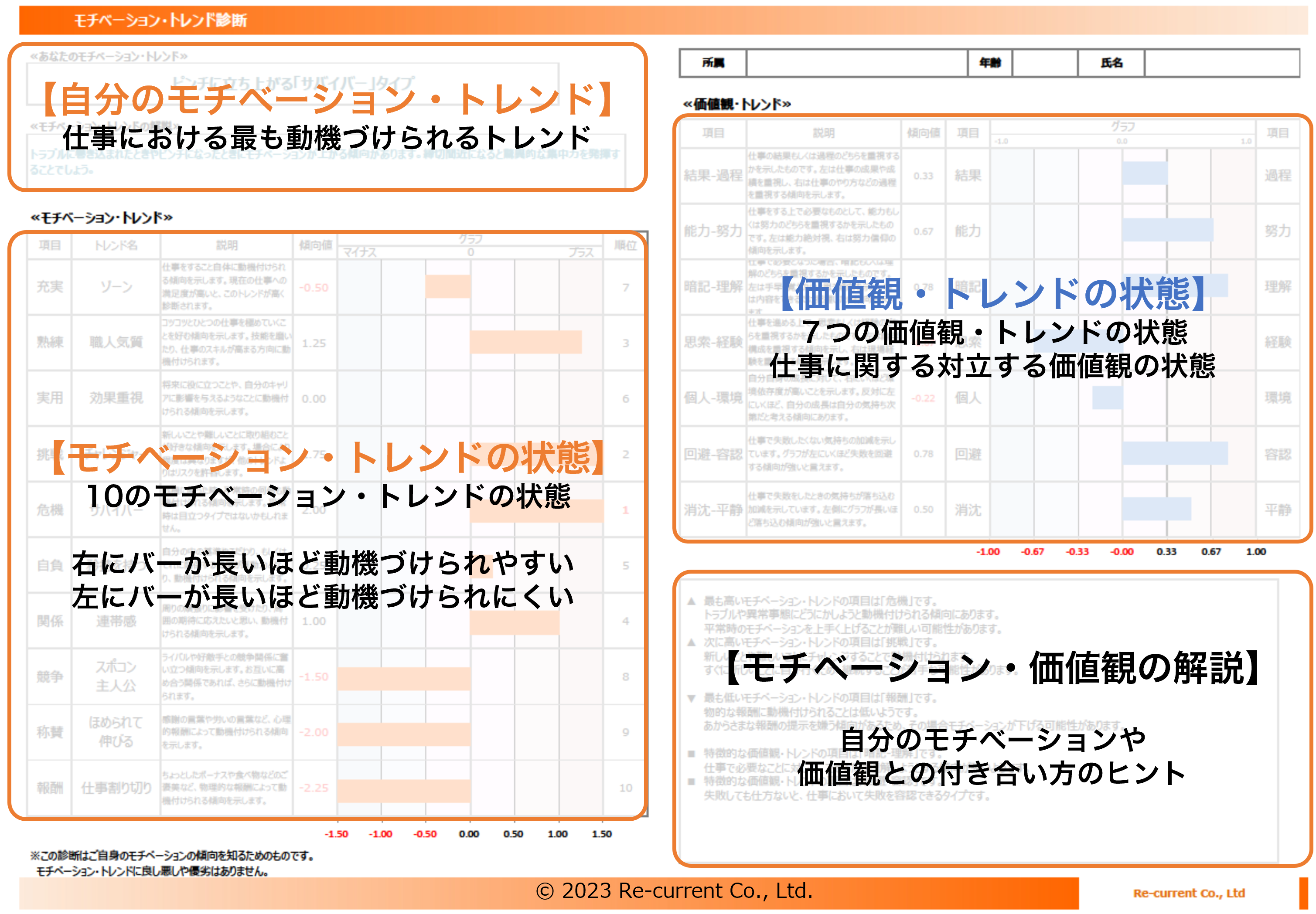 この診断を通して社員のモチベーションの源を可視化することで、自身のキャリア開発やOJTトレーニング・部下育成への活用を支援します。