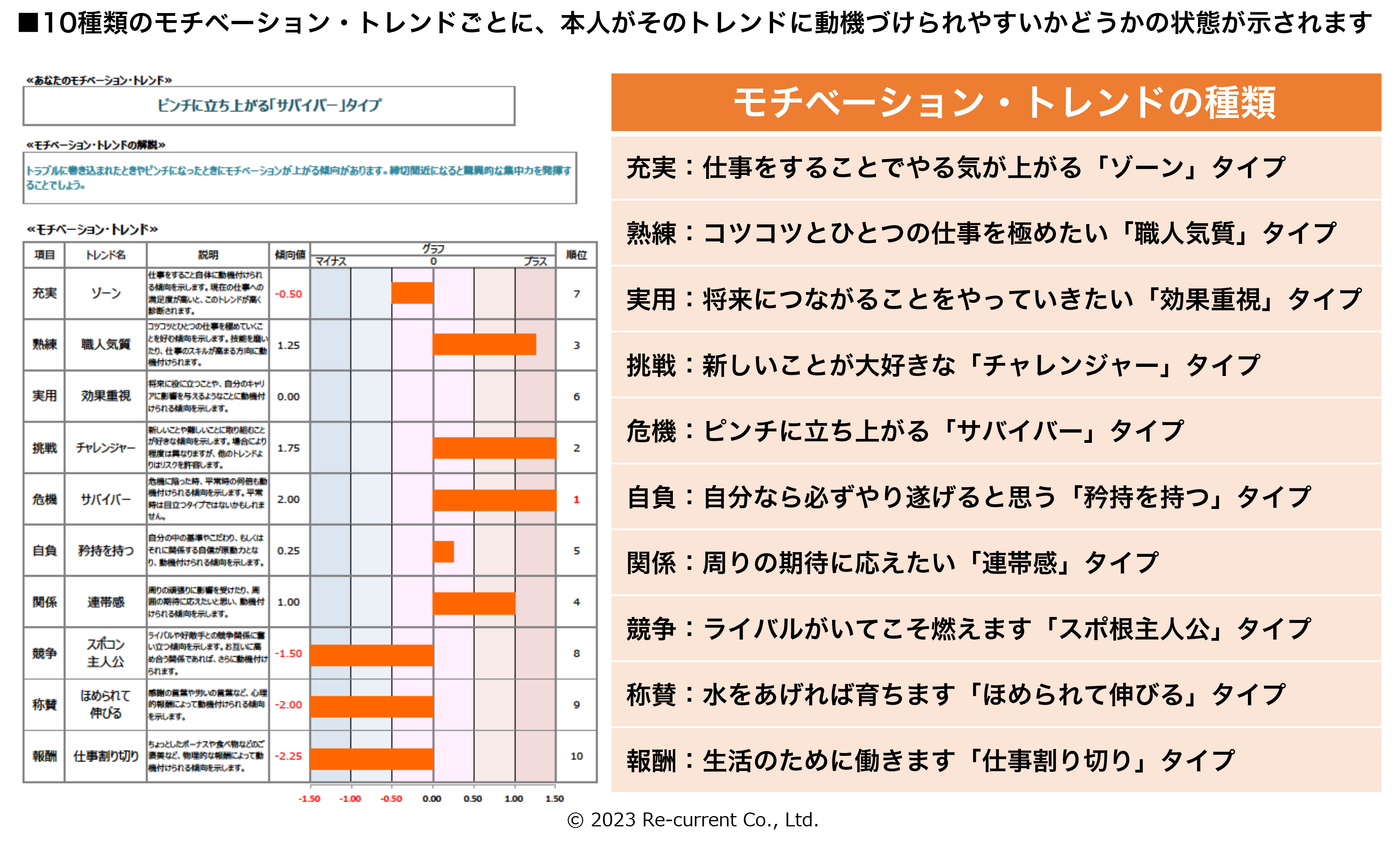 モチベーション・トレンド診断によって、仕事において重視する価値観や思考傾向を10種類のタイプ別に診断します。