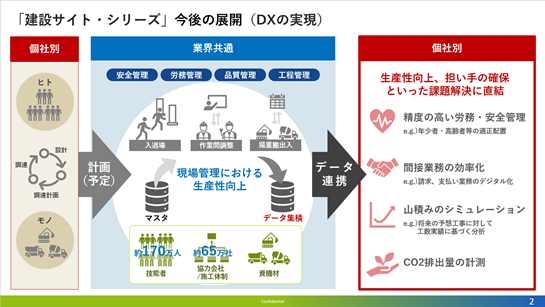 それに応えるべく、グリーンサイトに続くワークサイトなどの業界標準化や、元請会社・協力会社の皆様がシームレスに利用できる環境の提供を目指して取り組んでいくと表明しました。