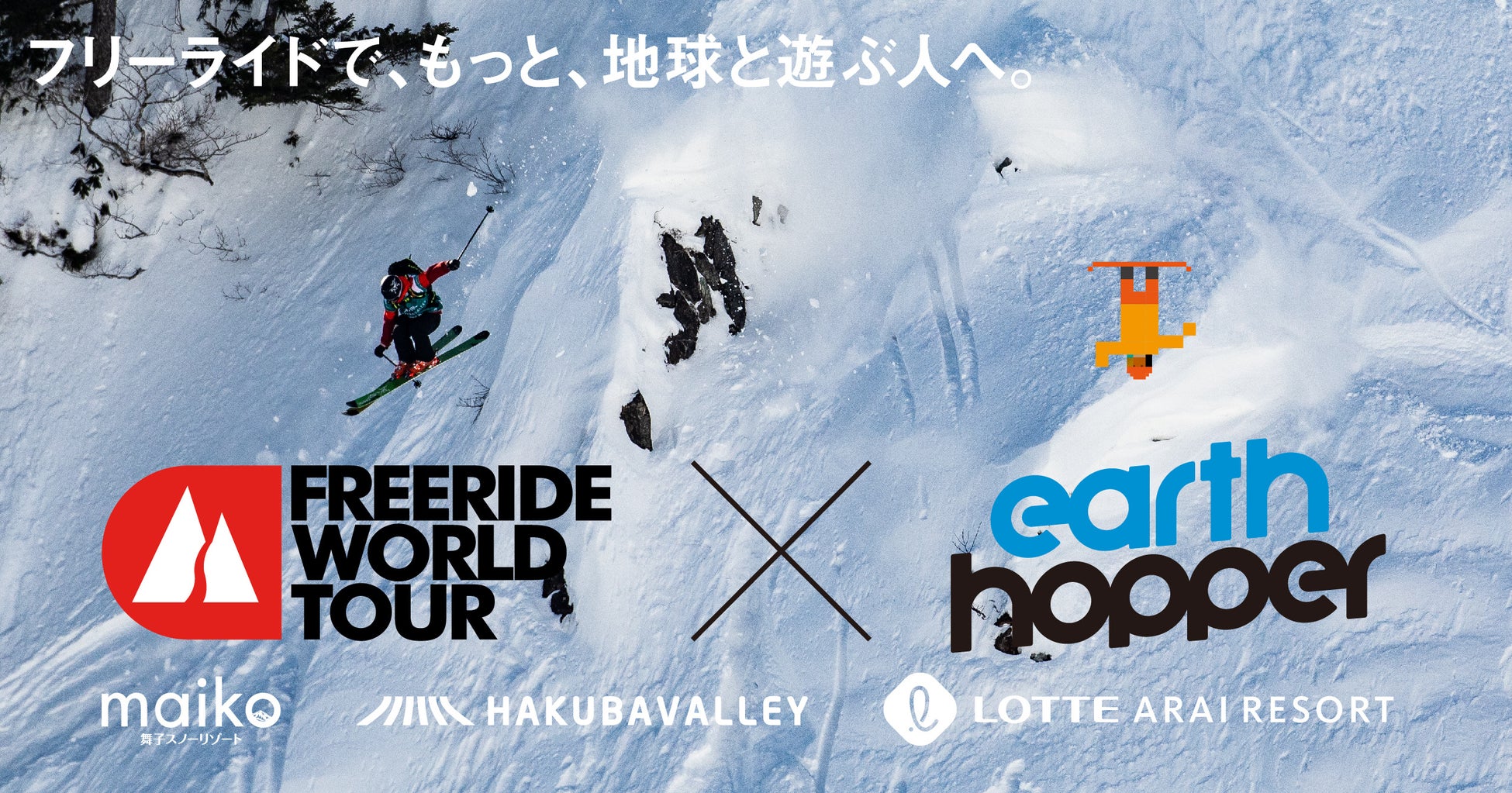 株式会社Pioneerworkは、自然のフィールドで行うスポーツを「アーススポーツ」と呼び、スキー・スノーボードの国際大会であるFreeride World Tourの日本国内大会の主催と、スキー場共通券の形からスタートしたオールシーズンパス「アースホッパー」の開発・販売を手がけています。アーススポーツの領域にさらなる価値を生むために、2つの事業を連携させたコラボ企画を行います。