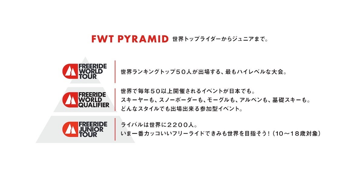 FWTは、自然のままの地形を滑り、そのテクニックやスタイルを競う“フリーライド”の世界一を決めるツアーです。大会区分は3つに分かれ、世界トップライダーからジュニアまで幅広い層が参加します- Freeride World Tour(FWT)