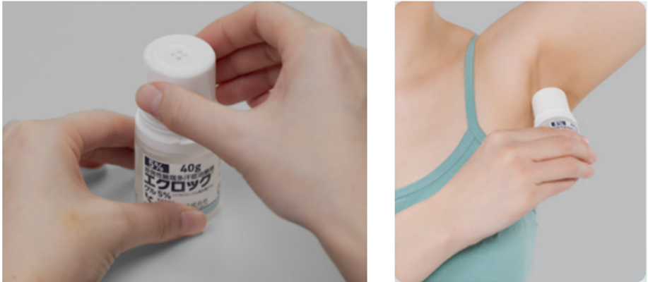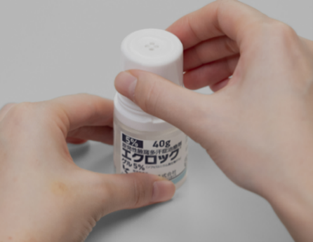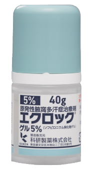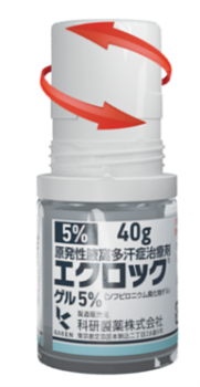 「エクロックゲル5%」は、日本初の外用の原発性腋窩多汗症治療剤であり、科研製薬が2020年11月より販売しております。「エクロックゲル5%(ツイストボトル)」は塗布部をひねる(ツイスト)ことで吐出面に計量された薬剤が吐出され、直接腋窩に塗布できる新容器として、2023年6月に販売を開始しました。