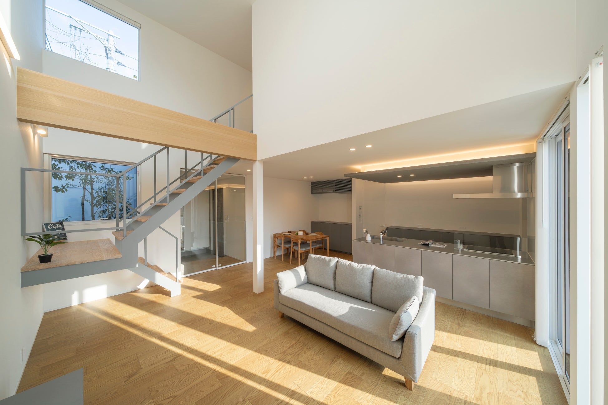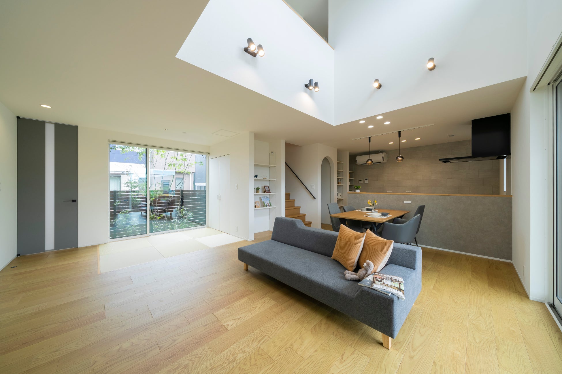 内と外が溶け合う開放感あふれるアウトドアリビングで自然の心地よさを感じられる家。吹き抜けを通して家全体につながりを感じられるので安心感に満ちた空間が作られています。自然とともに心地よく暮らせるまち全体が美しく成熟していくような環境づくりを目指した新たな分譲地です。