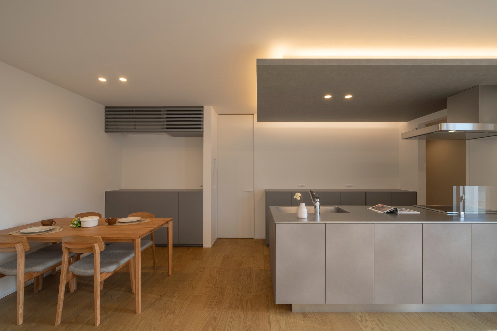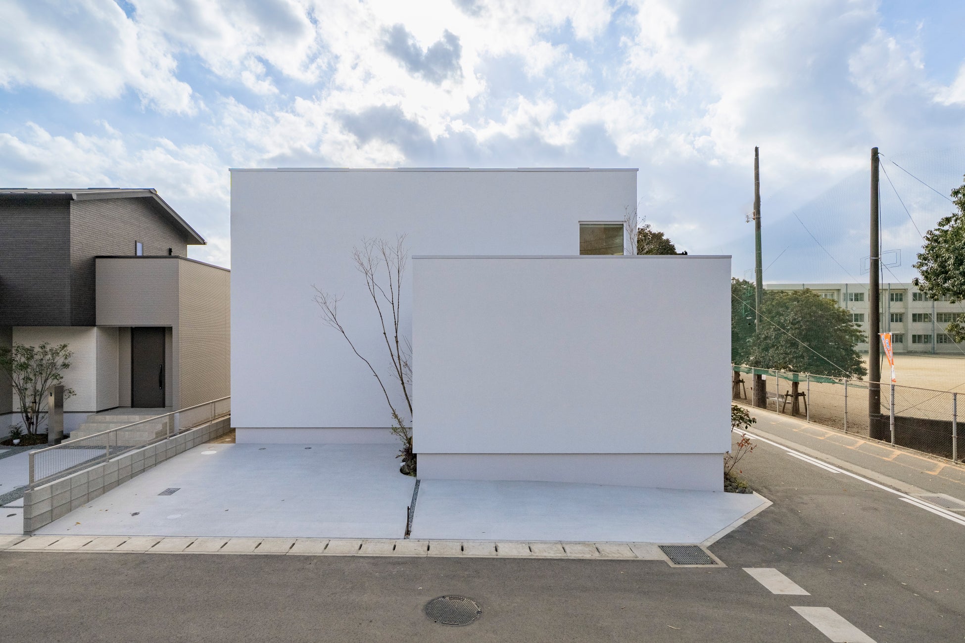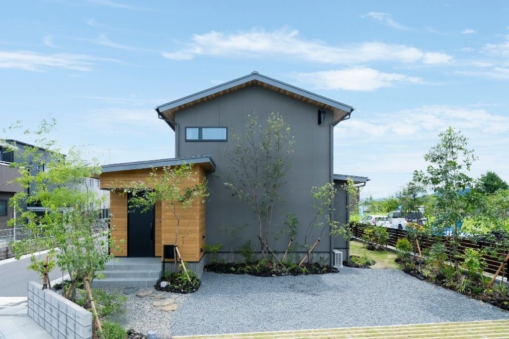 エアコン一台で夏涼しく、冬暖かい家を実現しました。Stoの塗り壁を使った植栽が映える箱型のシンプルな外観です。グレーで統一感のあるホテルライクな空間になっています。