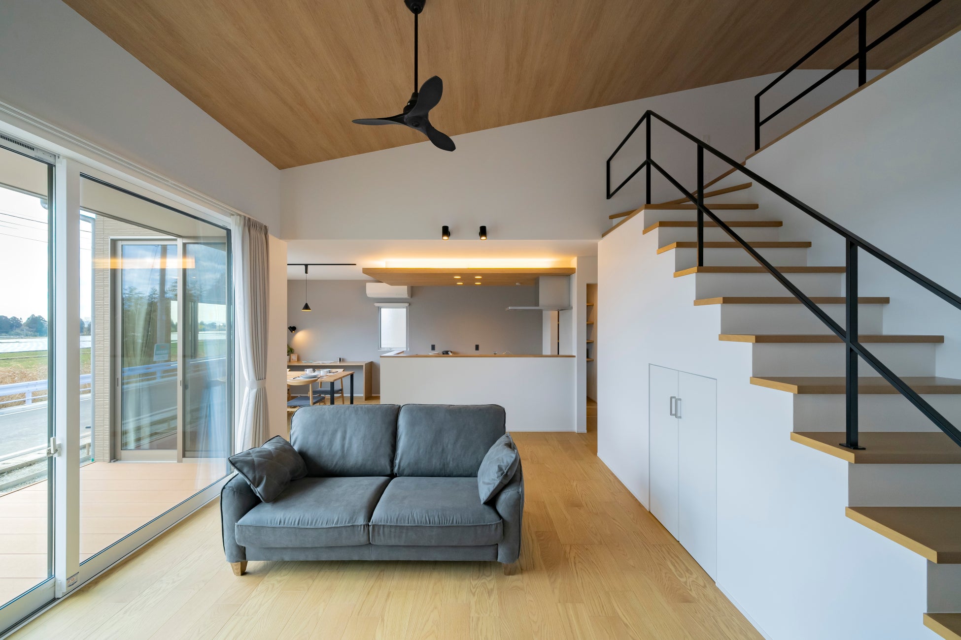 勾配天井にすることで平屋とは思えない開放感を演出します。スペースを有効活用し、まるで秘密基地のような、おこもり空間のロフトを作っています。大容量の収納スペースを作ることでスッキリとした空間ができました。