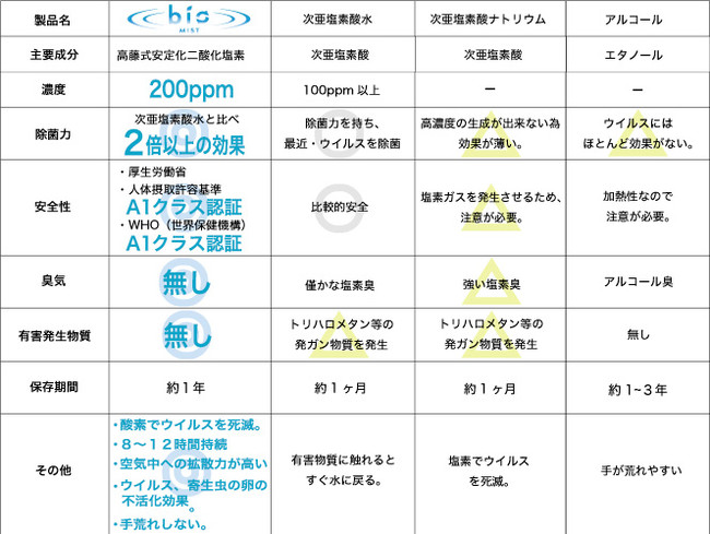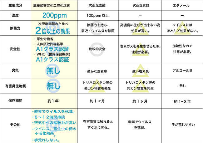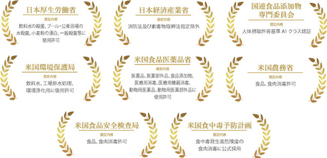 安定化二酸化塩素は次亜塩素酸ナトリウム(サラシ粉)などの塩素系化合物の2.6~3倍の高い除菌力を持ちながら、高い安全性があることが認められています。安全性に関してはWHO(世界保健機構)によりクラスA1(砂糖や塩と同クラス)に分類されています。国連食品添加物専門委員会、米国環境保護局、米国食品医薬品局、米国農務省、米国食品安全検査局など国内外の様々な公的機関に認定を受けており、日本の国際空港や大手病院などたくさんの公共機関で使用されています。